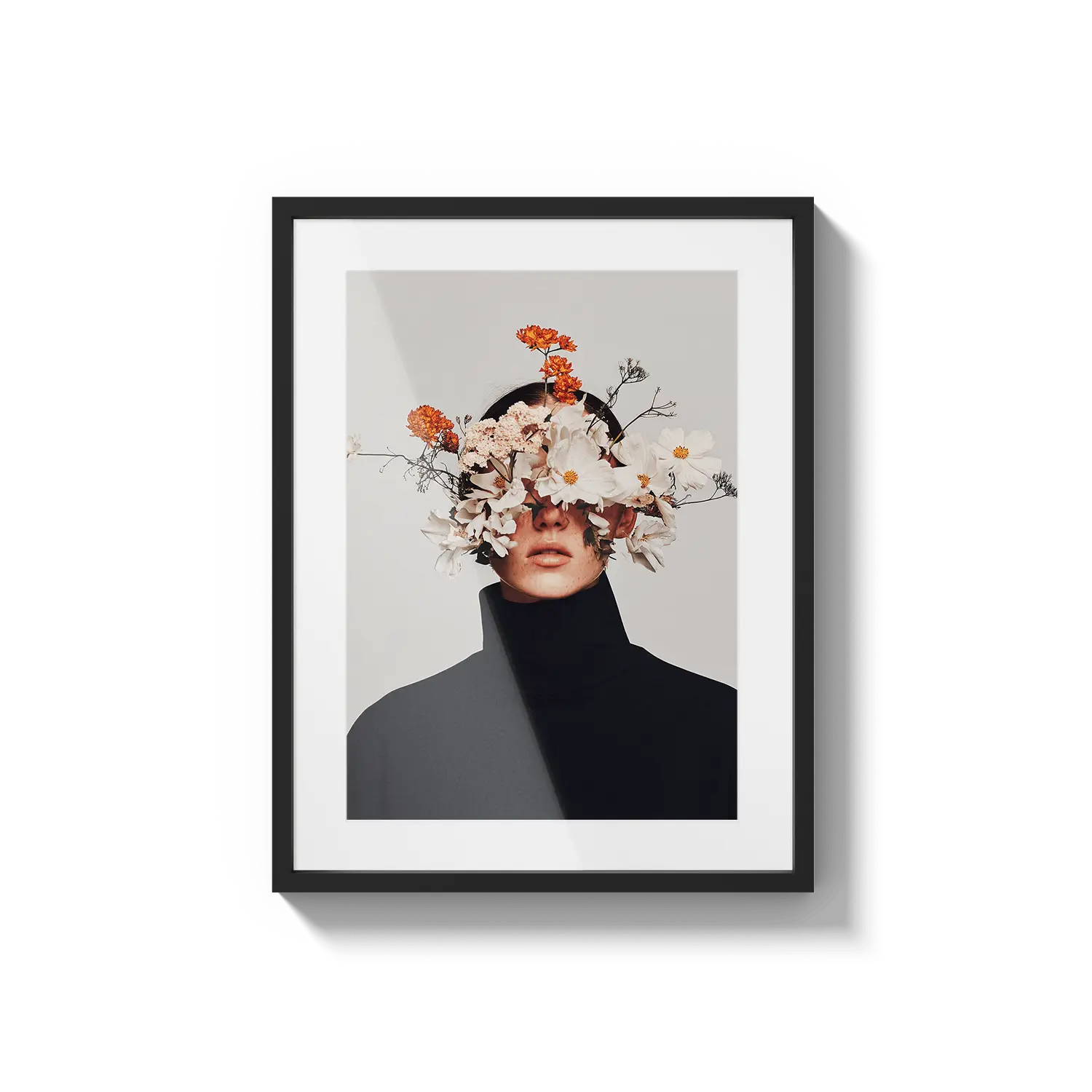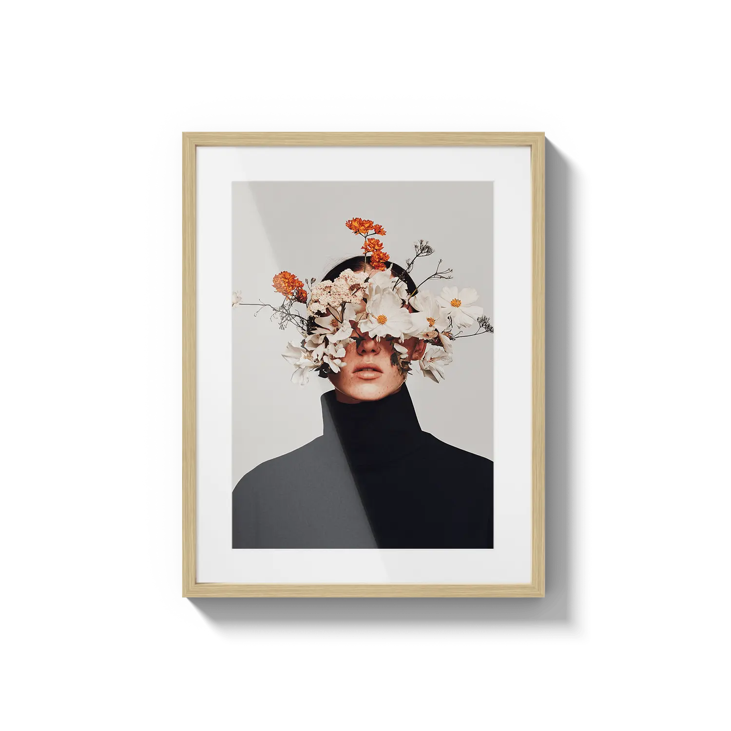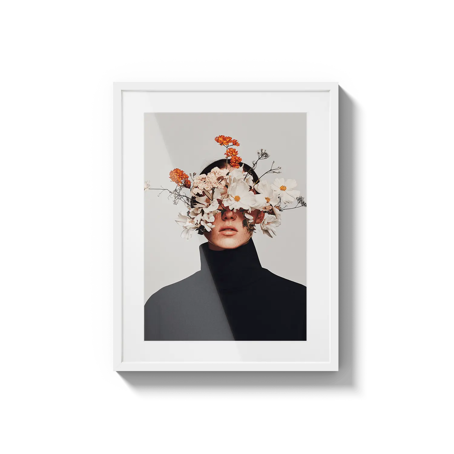 Ein ruhiges Porträt, in dem Blumen sanft um das Gesicht blühen und Stille und Vorstellungskraft miteinander verbinden. Ein zartes und ausdrucksstarkes Geschenk.