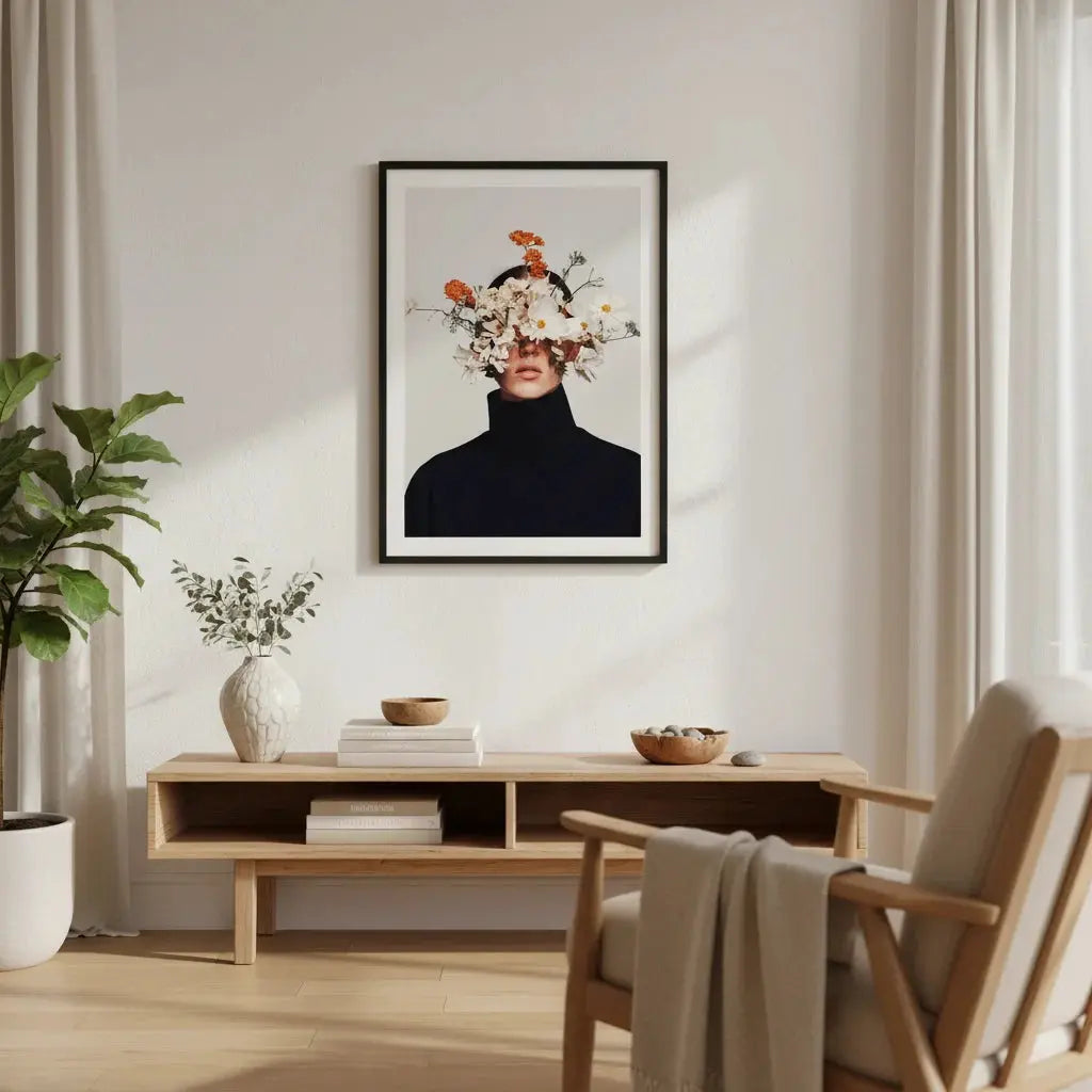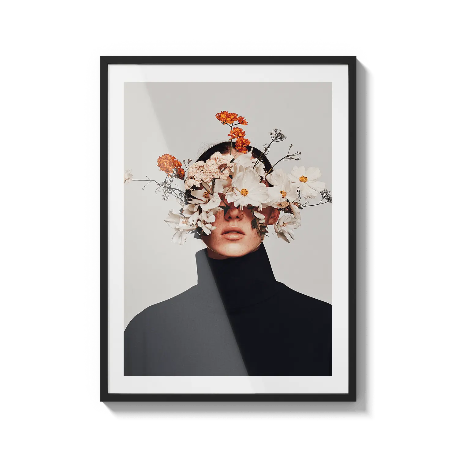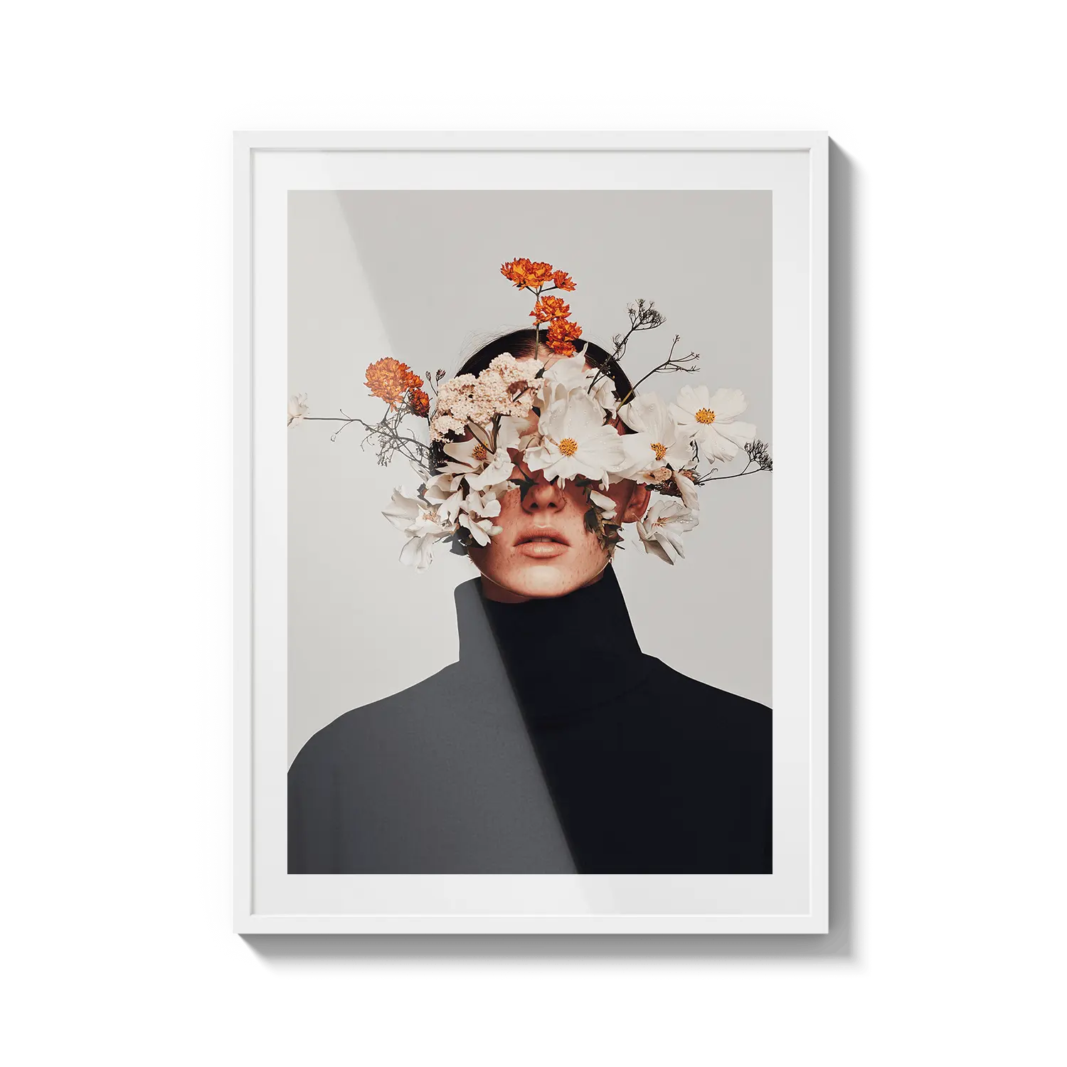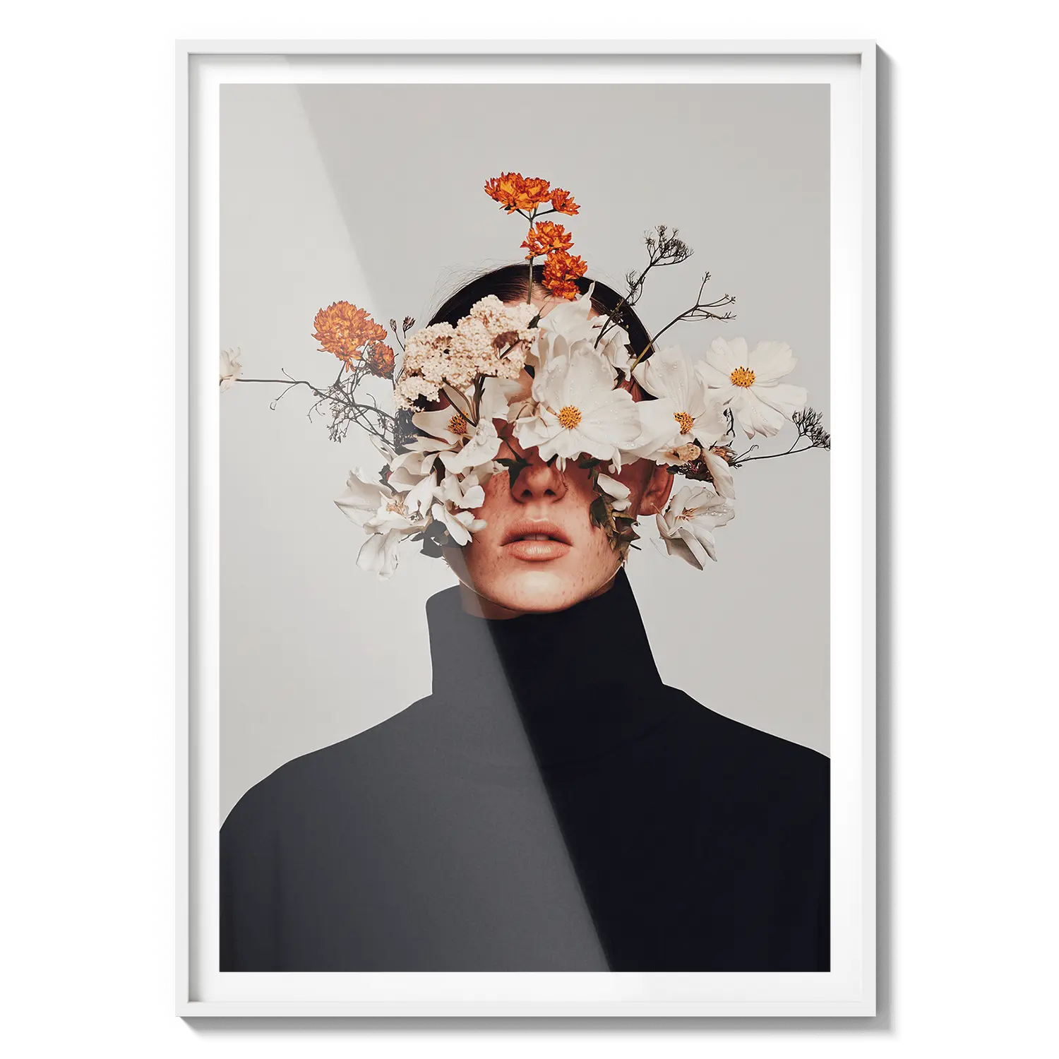 Ein ruhiges Porträt, in dem Blumen sanft um das Gesicht blühen und Stille und Vorstellungskraft miteinander verbinden. Ein zartes und ausdrucksstarkes Geschenk.