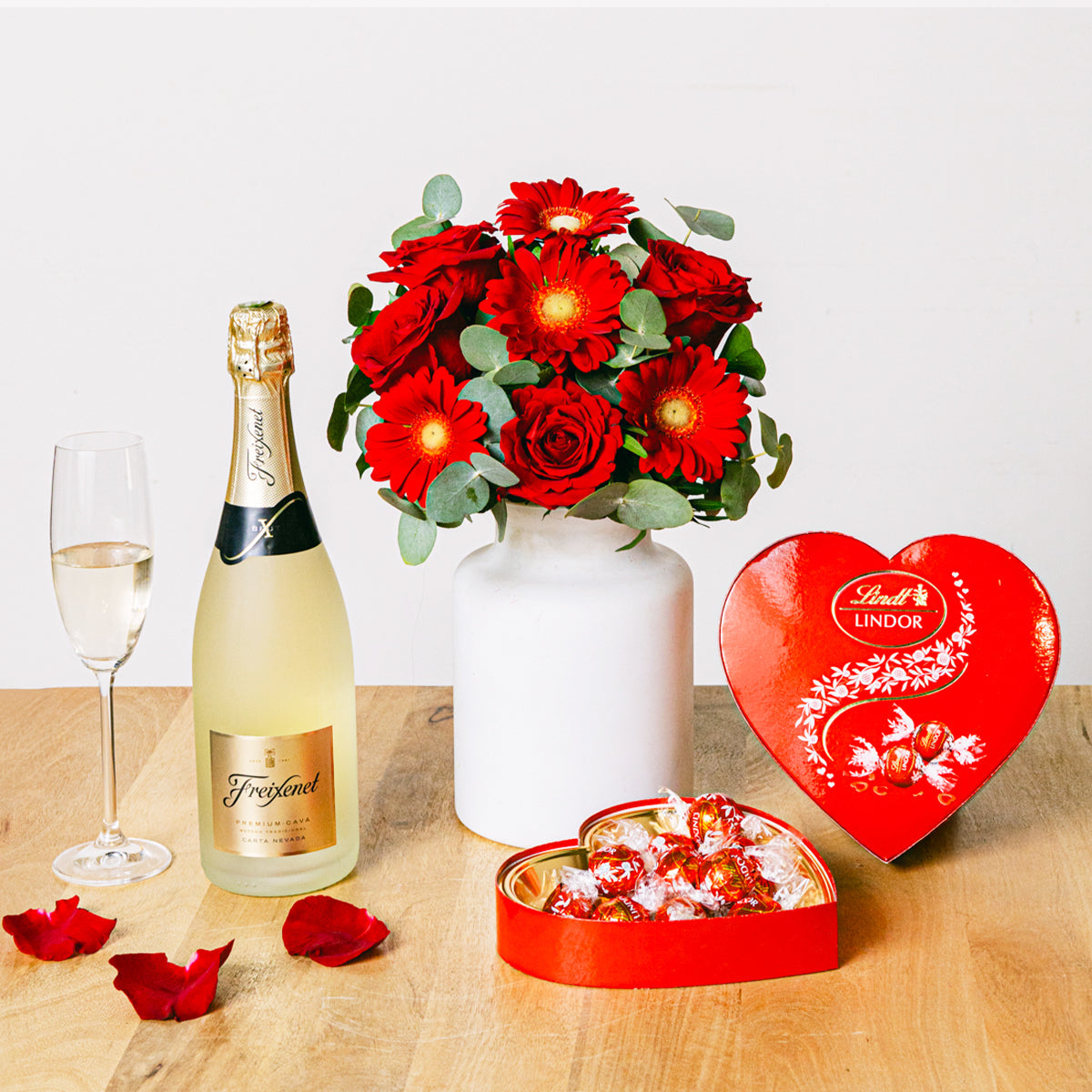 Die leuchtend roten Rosen symbolisieren leidenschaftliche Liebe, während die sonnigen Gerbera einen verspielten Akzent setzen. Die durchdachte Kombination aus Blumen und Leckereien schafft ein rundum gelungenes Geschenkerlebnis, das garantiert einen bleibenden Eindruck hinterlässt. Die wunderschöne Präsentation macht es zum idealen Geschenk für jeden besonderen Anlass.