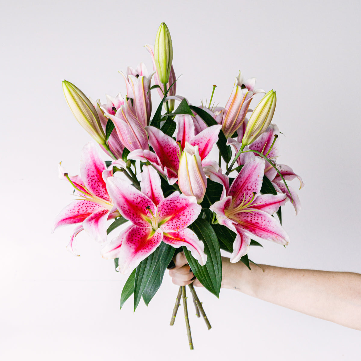 Rosen, Asiatische Lilien, Nelken, gemischtes Grün.