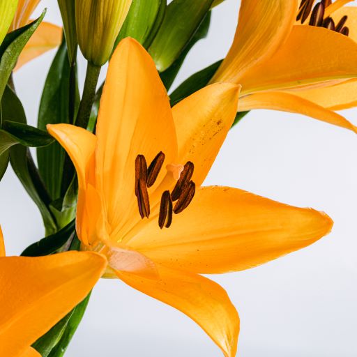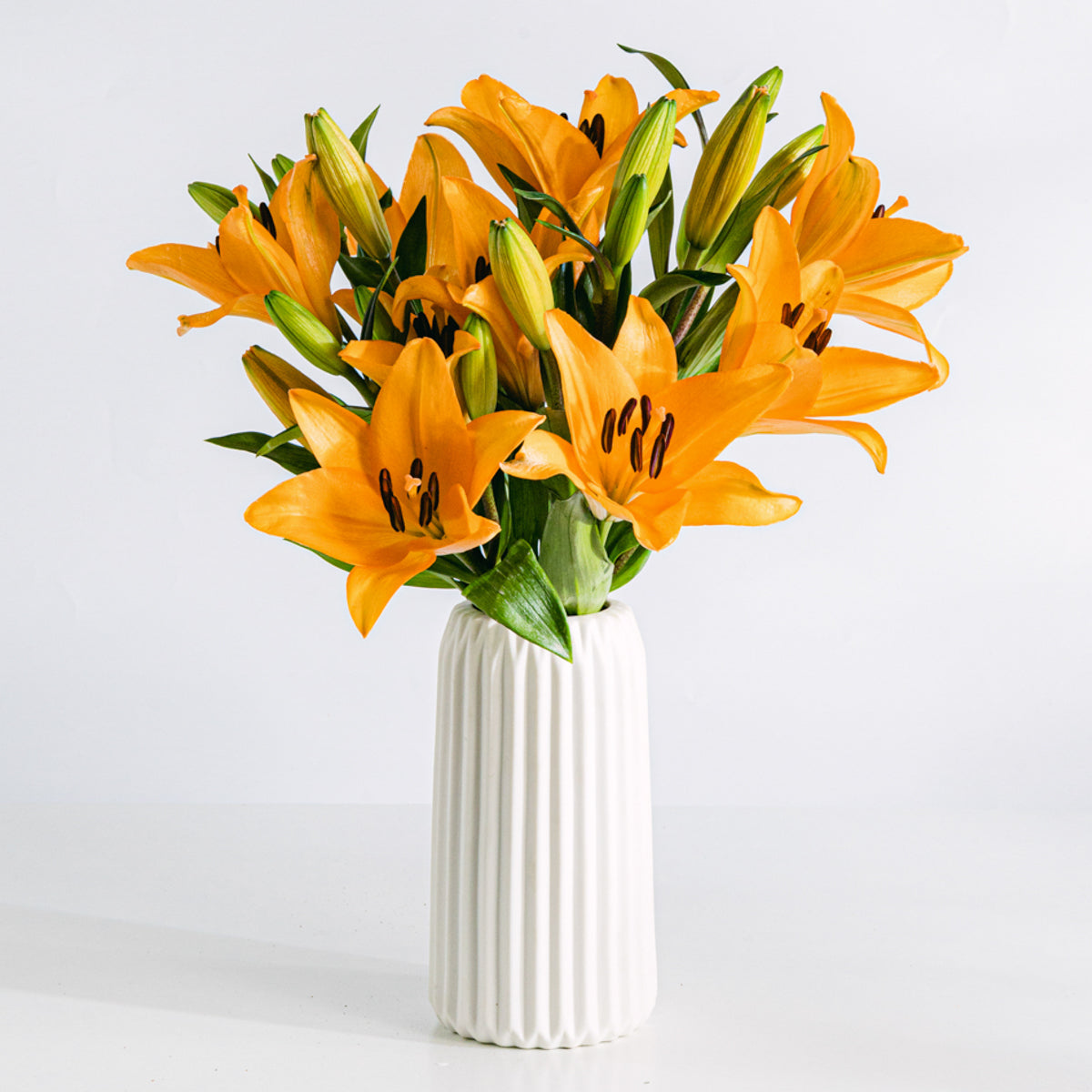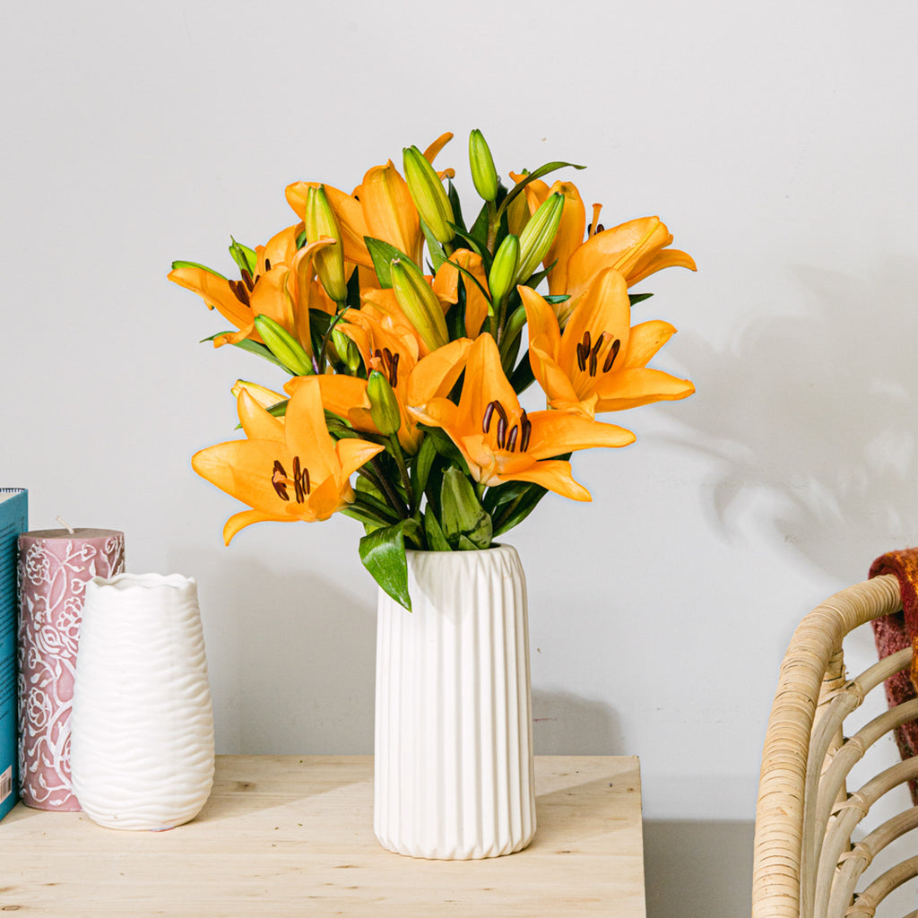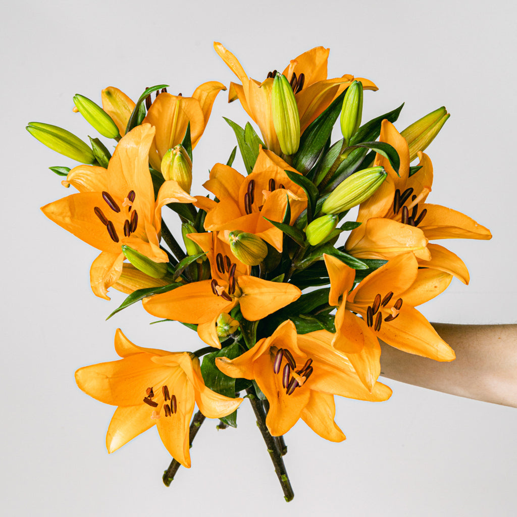 Feiern Sie jeden wichtigen Moment Ihres Lebens mit Ihren Lieben und in Gesellschaft der großen Blüten der orangefarbenen Asiatischen Lilie, deren breite Blütenblätter von Liebe, Hingabe und der Intensität sprechen, mit der wir jede Aufgabe angehen. Perfekt, um ... die geleistete Arbeit anzuerkennen.