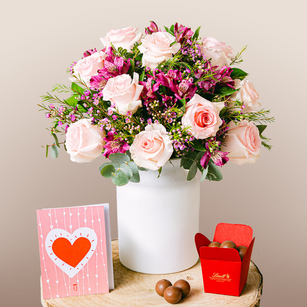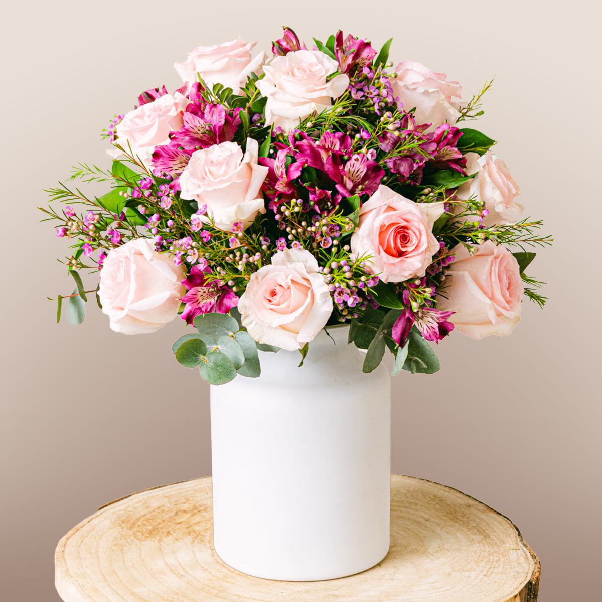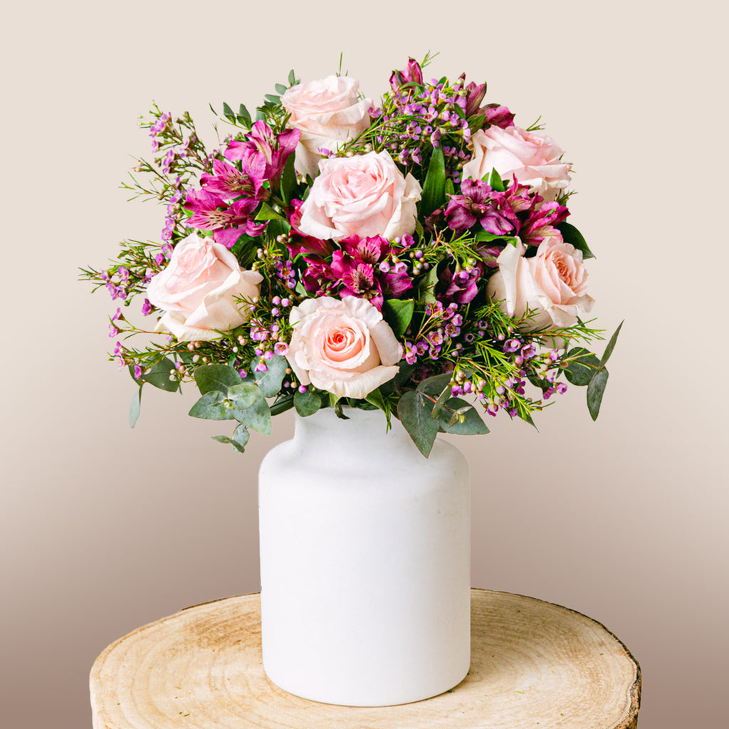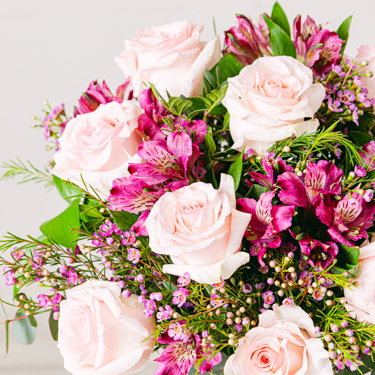 Versenden Sie diesen süßen Rosenstrauß! Er kombiniert rosa Rosen mit lila Inkalilien und Wachsblumen. Perfekt, um jemandem zur Verlobung zu gratulieren, ein neues Zuhause zu eröffnen oder eine Geburt zu feiern.