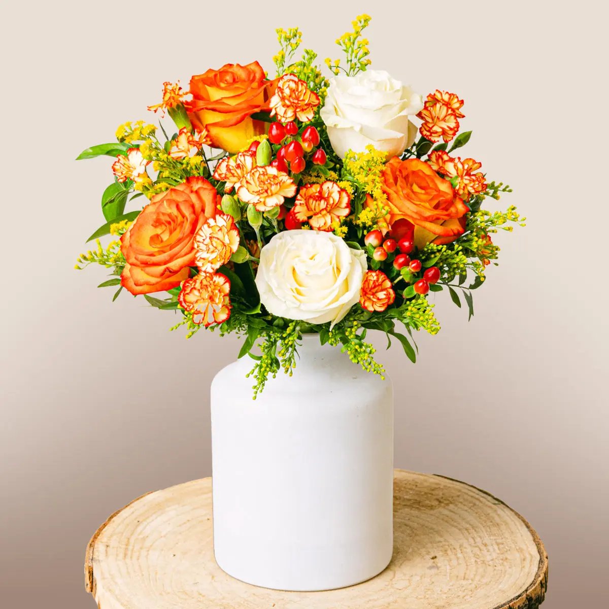Genießen Sie diese elegante Mischung aus Orange und Rosa – eine Mischung aus Wärme und Freude. Die Balance zwischen weißen und orangefarbenen Rosen und orangefarbenen Nelken ergibt die perfekte Kombination für ein schönes Geschenk in einer fröhlichen Dekoration. Der Strauß eignet sich ideal für besondere Anlässe und strahlt Wärme und Freude in einem gemütlichen Zuhause aus.