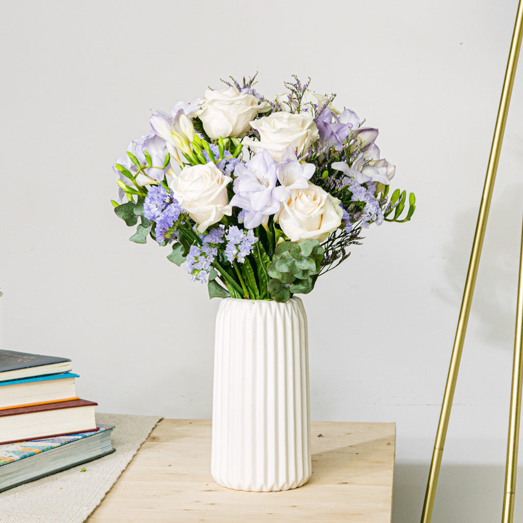 Bei Ankunft: Stellen Sie Ihren Strauß in eine saubere Vase mit frischem, zimmerwarmem Wasser sofort nach der Lieferung.