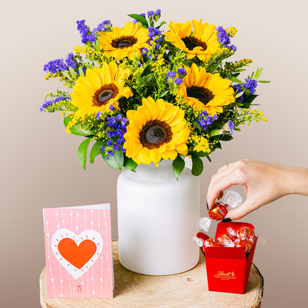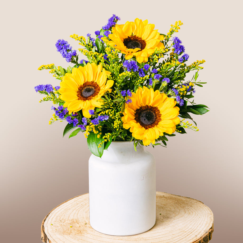 Mit dem Glanz sonniger Sonnenblumen und der kühlen Frische von Strandflieder haben wir eine bezaubernde Mischung aus purem Glück geschaffen. Die Sonnenblumen erhellen jeden Raum und sind ein unvergessliches Geschenk für einen besonderen Menschen, der Ihren Tag mit nur einer Nachricht sofort verschönern kann. Es ist die beste Art, „Danke“ zu sagen und sie mit Sommerfreude strahlen zu lassen.