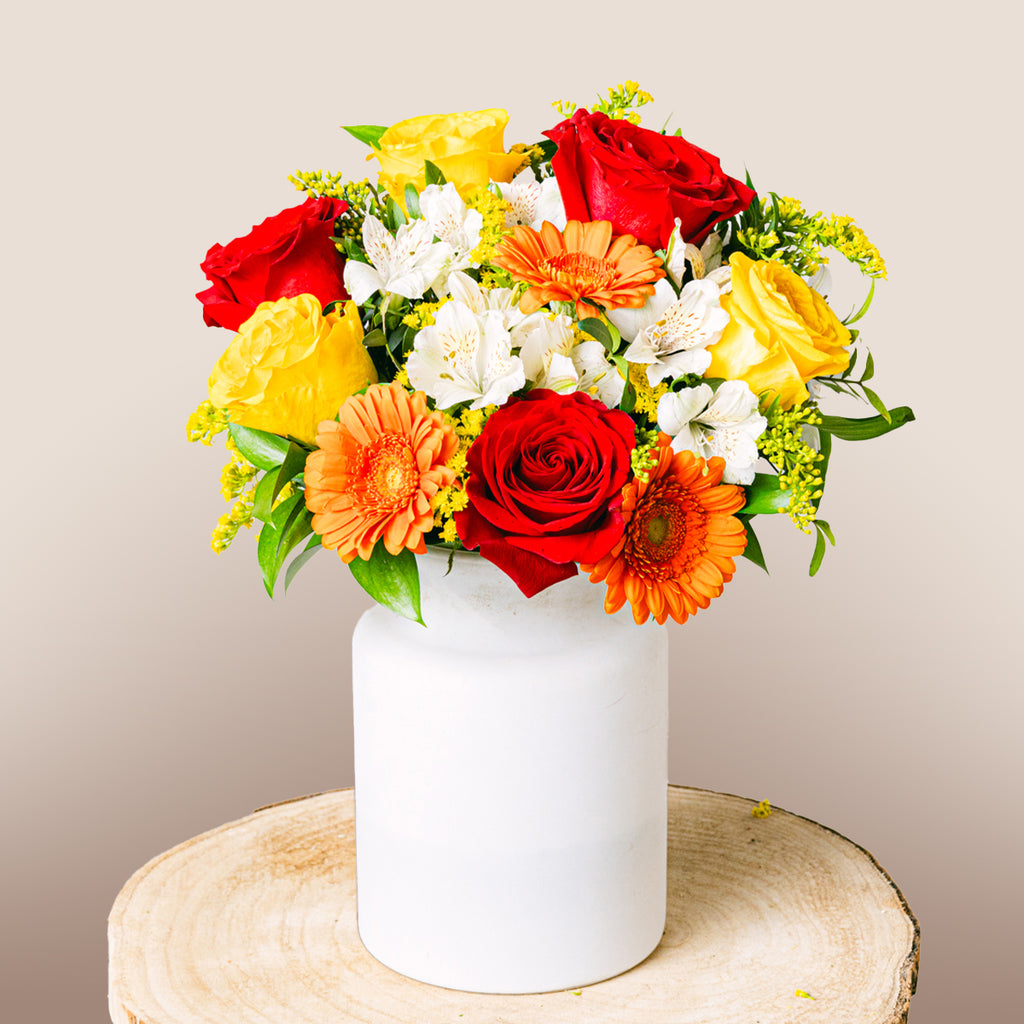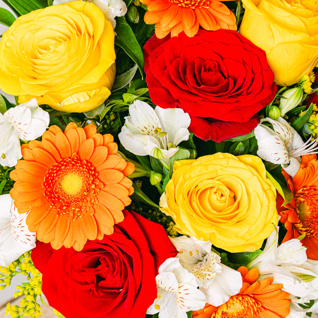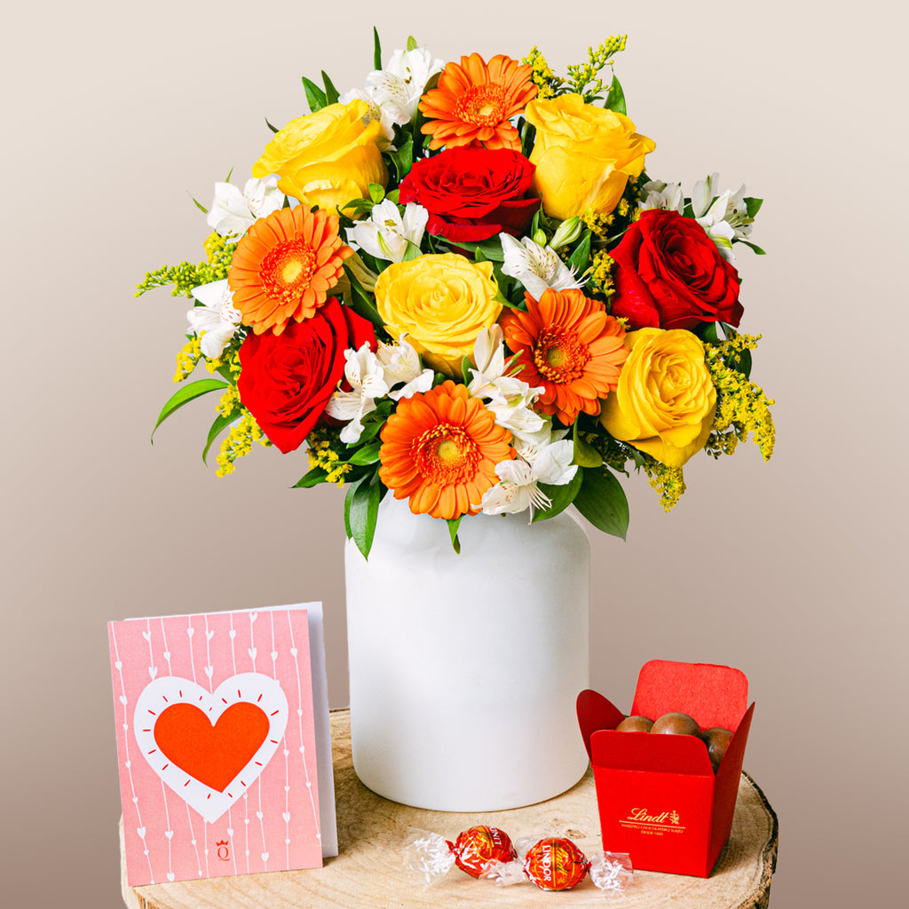 Dieser gewagte Strauß voller explosiver Farben ist eine leidenschaftliche Art, Ihre Gefühle auszudrücken. Eine Mischung aus Farben und Liebe – dieser Strauß wird Ihre Liebste/n zum Geburtstag oder als Dankeschön mit Sicherheit überraschen und Ihnen ein besonderes Gefühl geben.