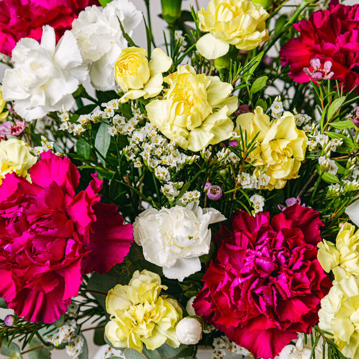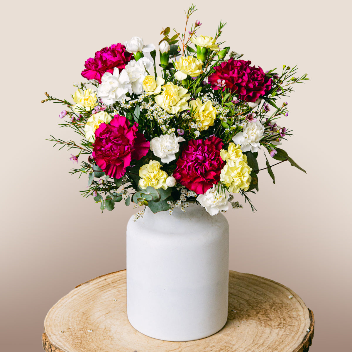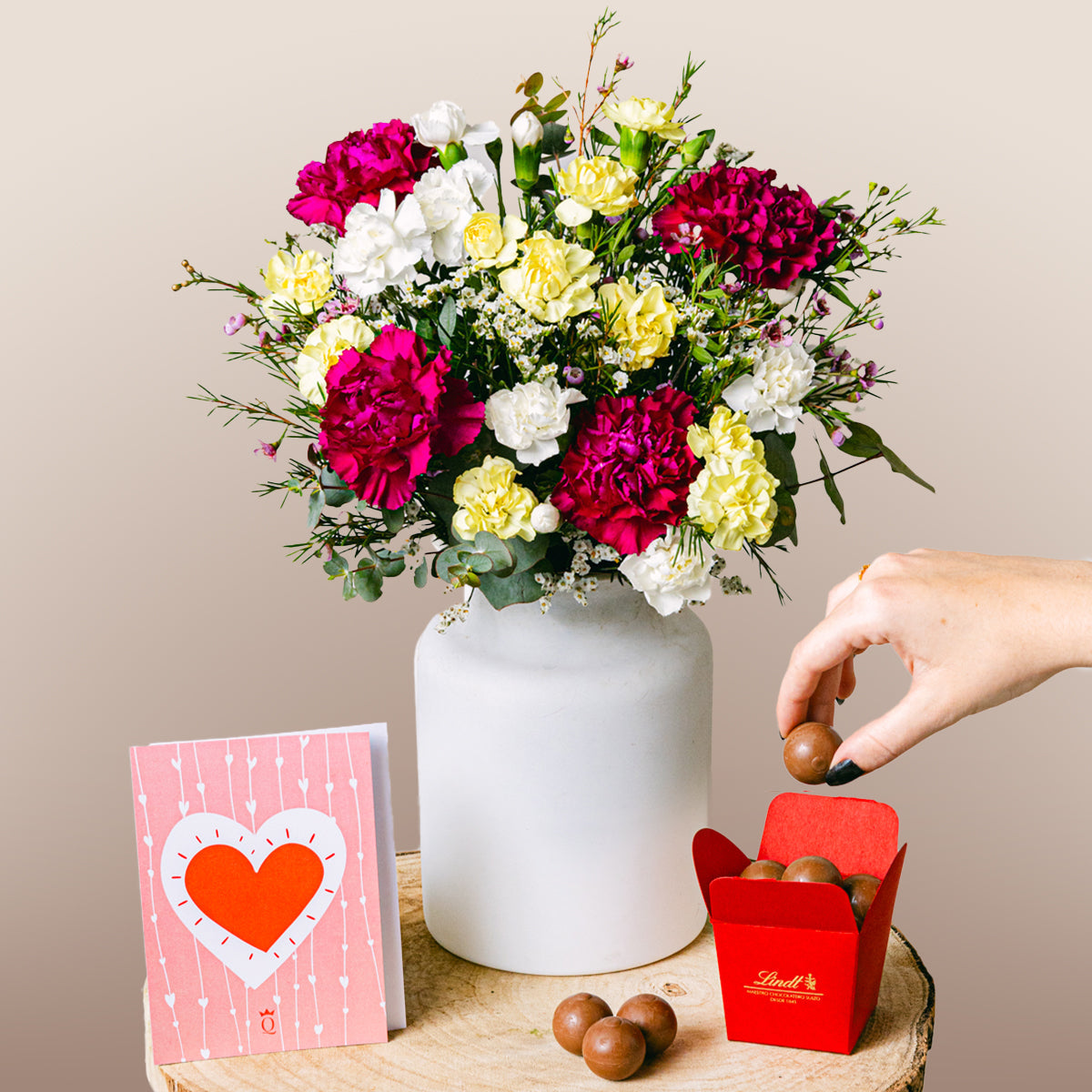 Erleben Sie die warme Umarmung der Zuneigung mit unserem Blumenstrauß „Herzliche Harmonie“, einer atemberaubenden Mischung aus leuchtenden Nelken und zarten Lisianthus. Dieses liebevoll zusammengestellte Arrangement spricht die Sprache der Liebe und Bewunderung und ist das perfekte Geschenk, um Herzen über große Entfernungen hinweg wieder zu vereinen. Die satten, tiefen Rot- und Rosatöne der Nelken symbolisieren tiefe Liebe und Zuneigung, während die weißen Lisianthus Reinheit und Unschuld repräsentieren und eine ebenso süße Botschaft vermitteln wie die dazugehörigen Pralinen.