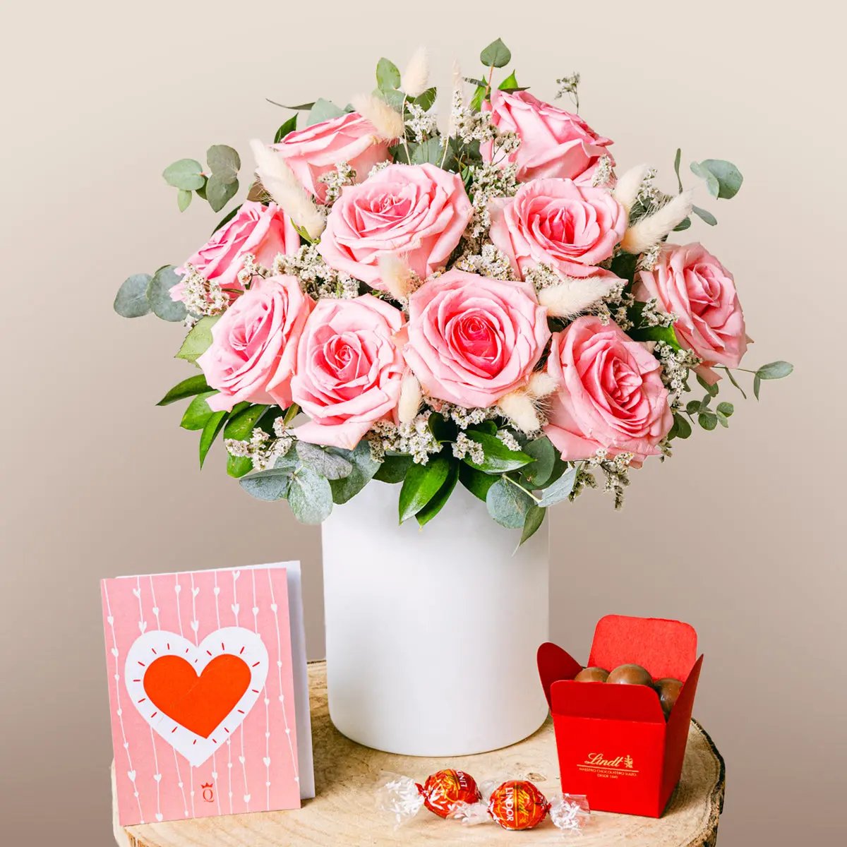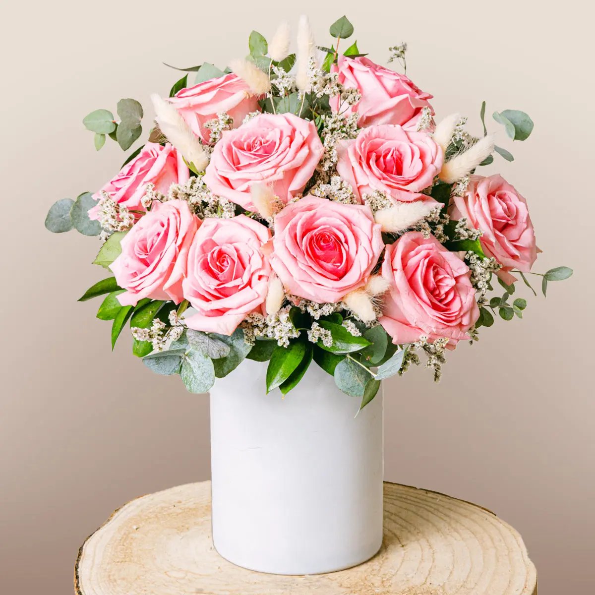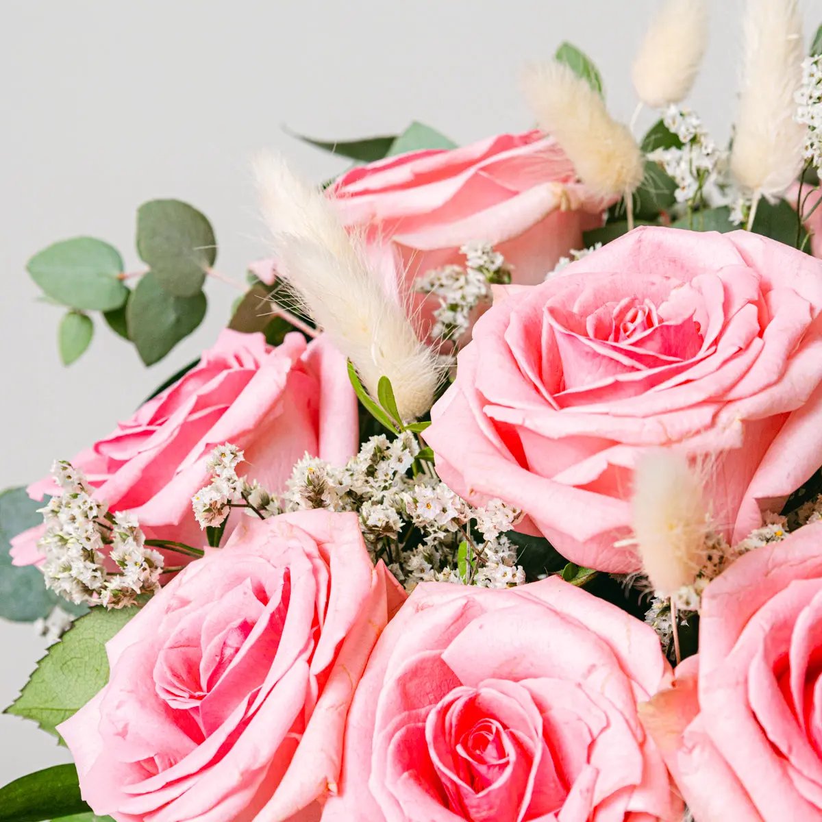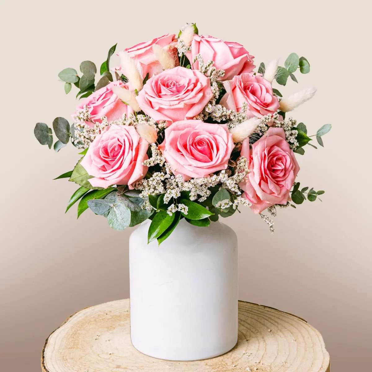 Mit einem Klassiker wie zartrosa Rosen kann man nichts falsch machen. Besonders in Kombination mit unwiderstehlichen Details wie Limonium und weißem Lagurus. Schlichtheit ist der Schlüssel zu Eleganz.