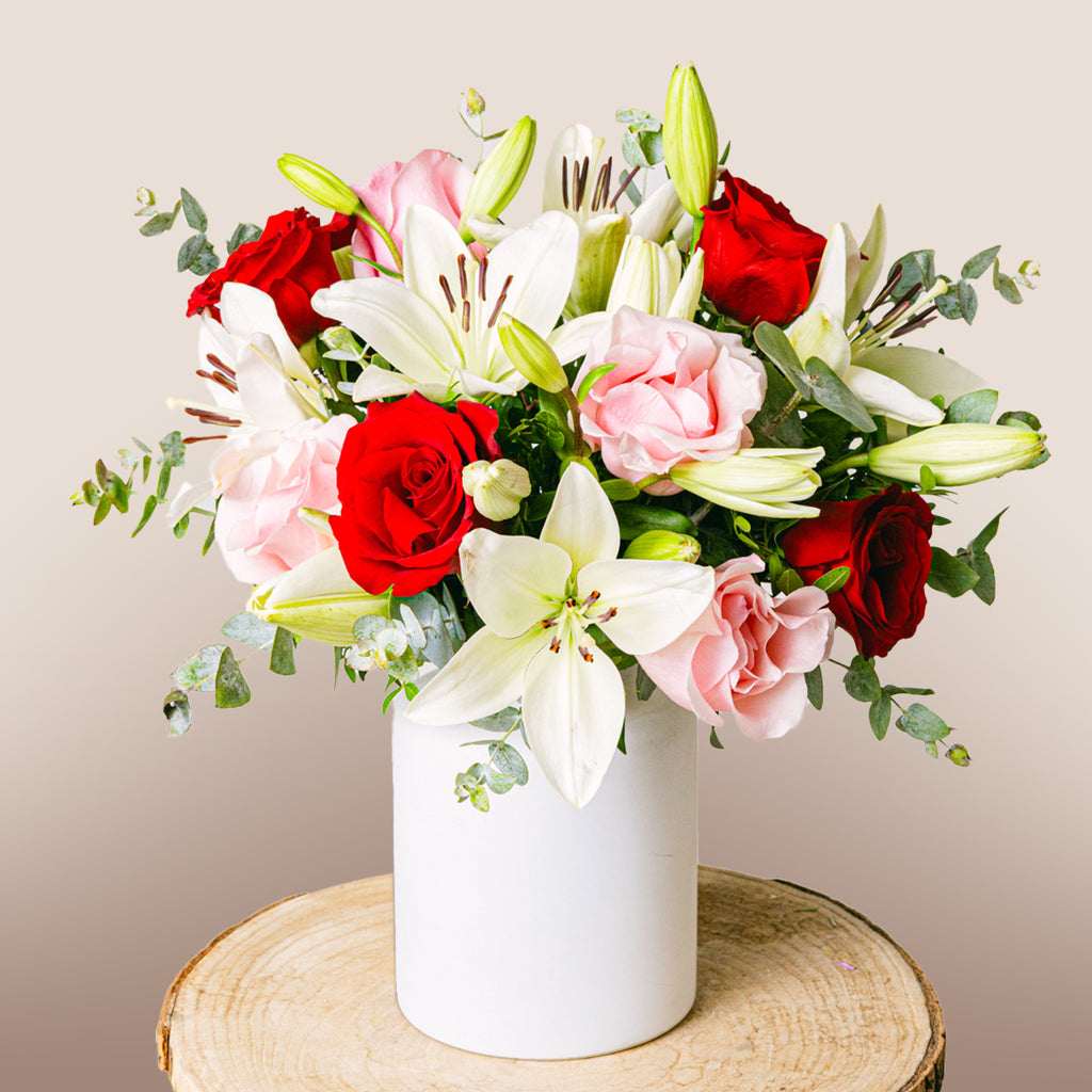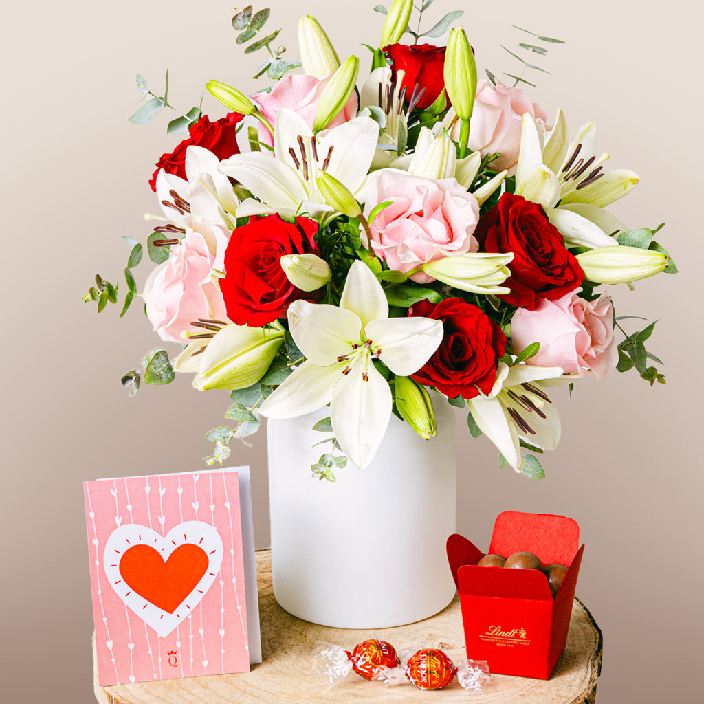 Dieses Arrangement aus Rosen und Lilien könnte das Dessert zu Ihrem Lieblingsessen sein. Die Rot- und Rosatöne der Rosen bilden einen zarten Kontrast zum Weiß der Lilien. Der perfekte Strauß, um eine tröstende Botschaft zu übermitteln und Ihre Lieben daran zu erinnern, dass Sie immer an ihrer Seite sind.