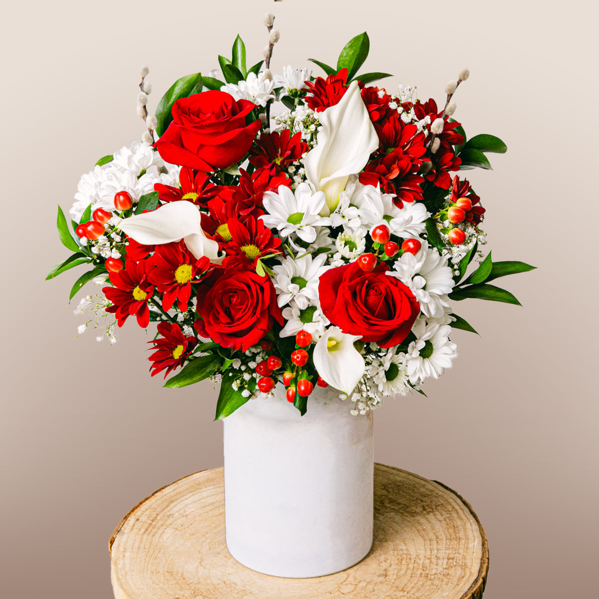 Die Kombination aus Rosen, Callas und Chrysanthemen schafft ein Gefühl von Frieden und Hoffnung in schwierigen Zeiten. Er ist ein Ausdruck bedingungsloser Unterstützung und eine Hommage an die Schönheit des Lebens.