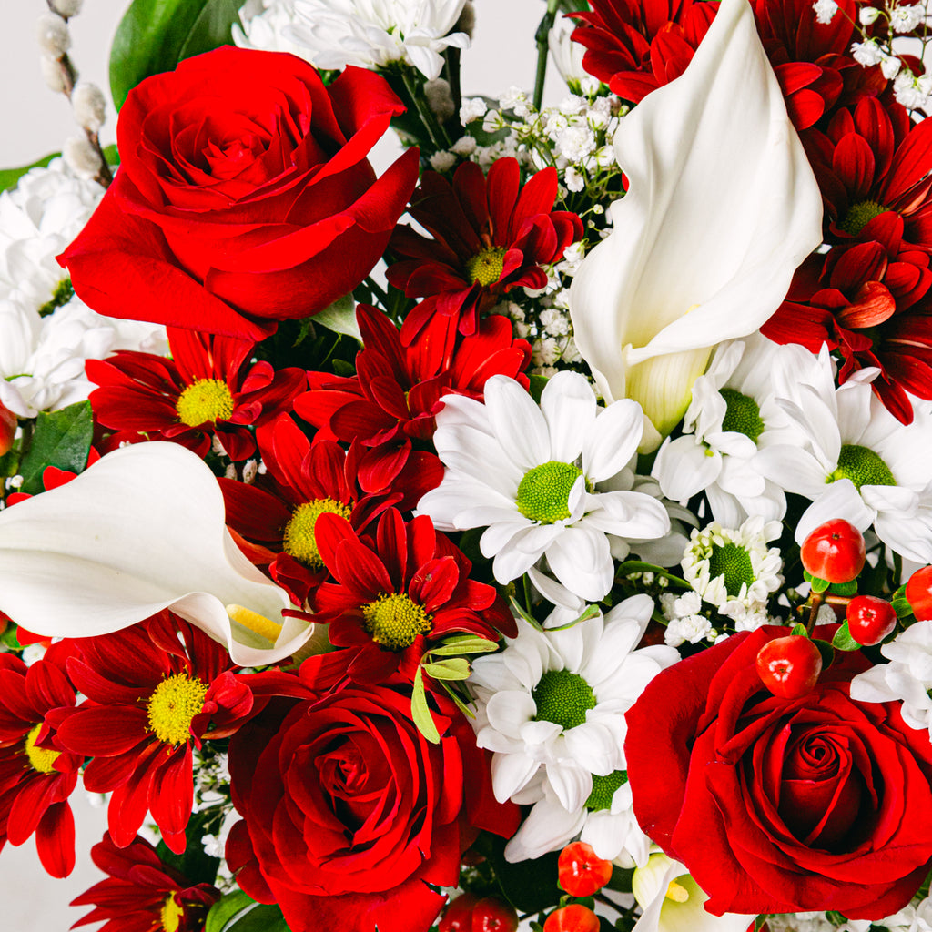 Calla-Lilien wurden nach dem griechischen Wort für schön – Calla – benannt. Sie gelten als Glücksbringer und sorgen für ganzjähriges Glück. Ihre Heiligkeit und Reinheit werden durch klassische und leidenschaftliche rote Rosen ergänzt, was diesen Strauß zu einem atemberaubenden Yin-Yang-Bouquet macht.