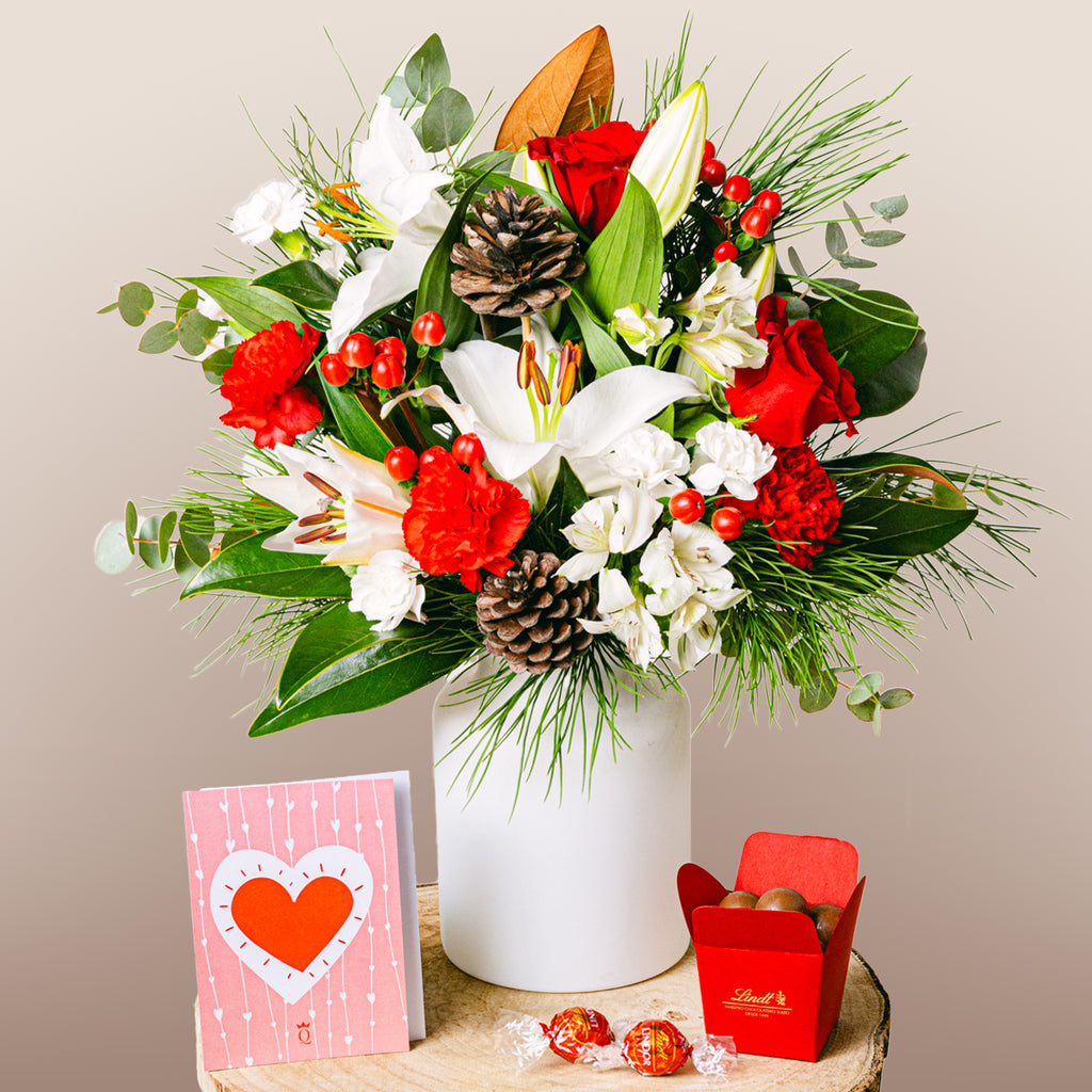 Wie könnte man Freunden oder Familie besser ein frohes neues Jahr wünschen als mit diesem prachtvollen Strauß voller Hoffnung und Frische? Weiße orientalische Lilien und Nelken, rote Rosen und Johanniskrautbeeren sowie frisches Wintergrün repräsentieren all die Farben, die einen Neuanfang symbolisieren. Ein eindrucksvolles und duftendes Arrangement, perfekt als Tischdekoration zur Feier des Jahres 2025.