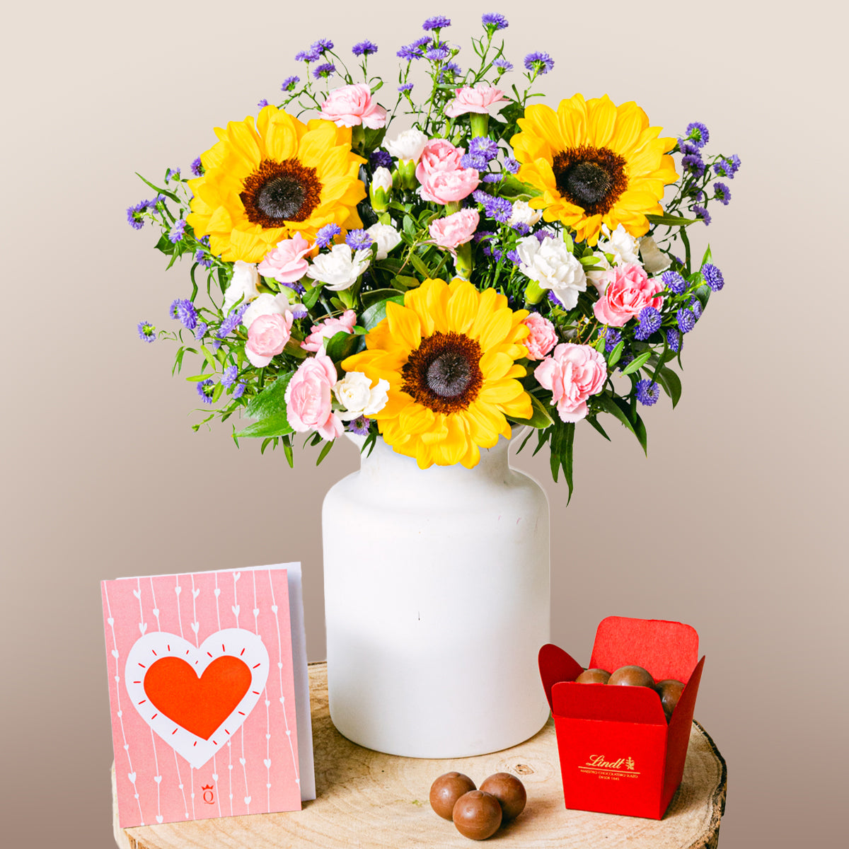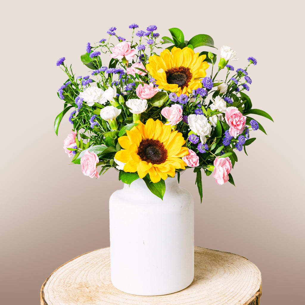 Laden Sie Ihre Liebste ein, einen farbenfrohen Sonnenuntergang in ihrem Wohnzimmer zu erleben. Dank des Gelbs der Sonnenblume, des Lilas des Strandflieders und des rötlichen Farbtons des Mastixstrauchs erinnert unser Strauß „Vibrant Sunset“ an einen wunderschönen Sommersonnenuntergang. Perfekt, um zu gratulieren oder die Liebste daran zu erinnern, wie glücklich sie Sie macht.
