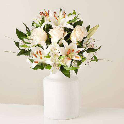Ein Strauß, der Reinheit und Eleganz ausstrahlt. Die zarte Schönheit der weißen Rose vereint sich mit den einzigartigen Akzenten der Alstroemeria, einer exotischen sechsblättrigen Blume, die in den sonnenverwöhnten Andengebirgen wächst. Das Arrangement ist mit weißen Lilien geschmückt, deren zarte rote Pinselstriche im Inneren der Blüte gerade noch sichtbar sind. Perfekt für … unsere Hochachtung.