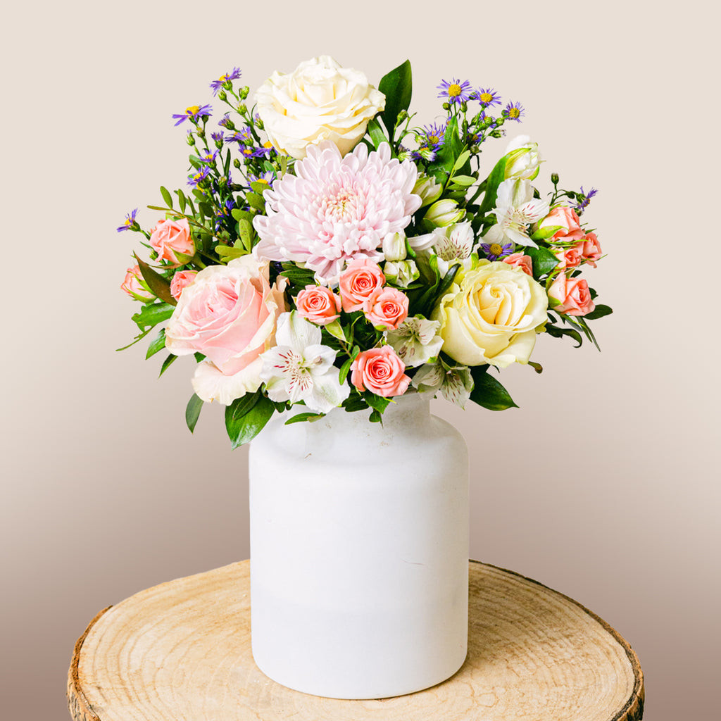 Die sanften Pastelltöne strahlen Ruhe und Gelassenheit aus und spenden Trost in schweren Zeiten. Dieser Strauß erinnert an die zarte Schönheit des Lebens und die Bedeutung wertvoller Erinnerungen.