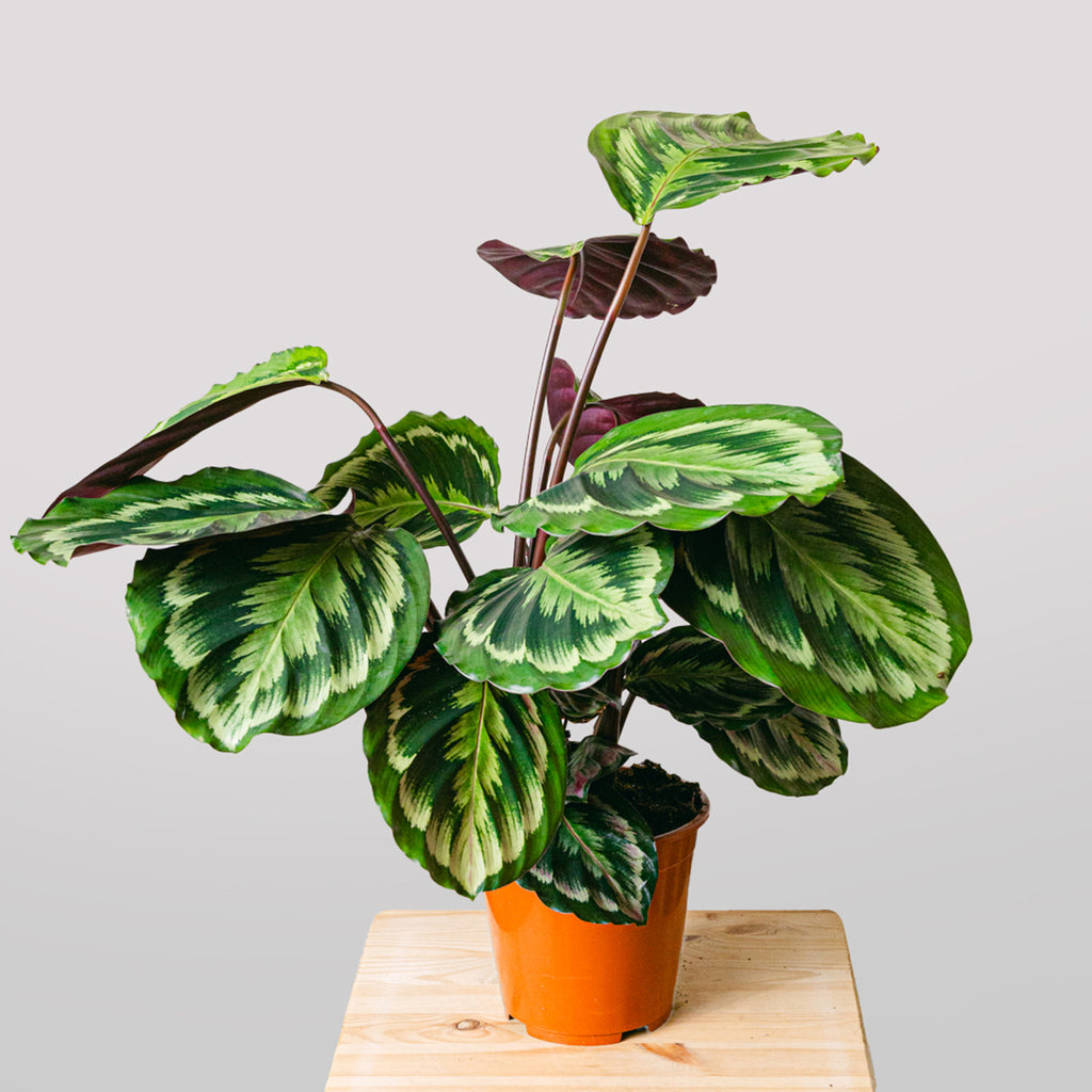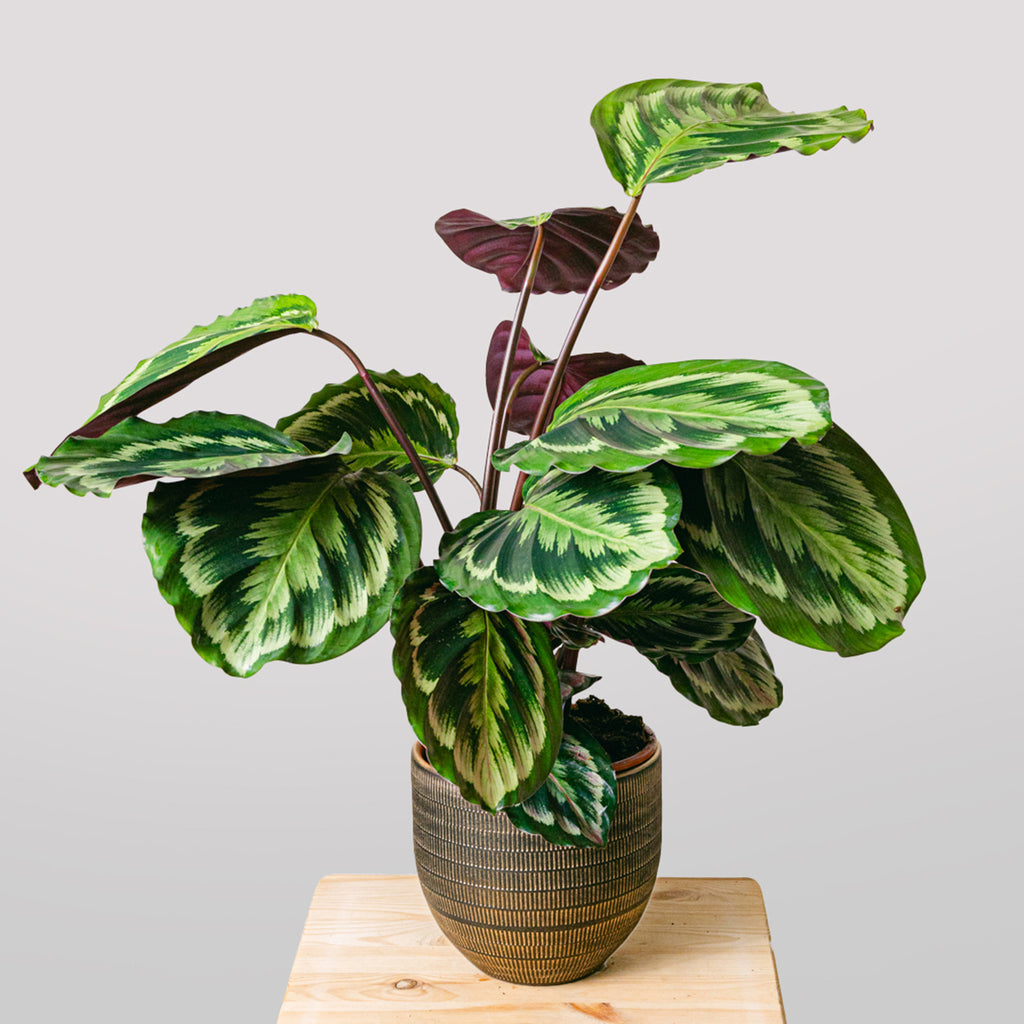 Die aus Brasilien stammende Calathea Medallion ist eine beliebte Wahl für die exotische Inneneinrichtung. Ihre gestreiften Blätter öffnen und falten sich je nach Tageszeit – ein unvergesslicher Anblick. Eine fröhliche, reinigende Pflanze, die auch Anfängern in der Pflanzenpflege zugutekommt.