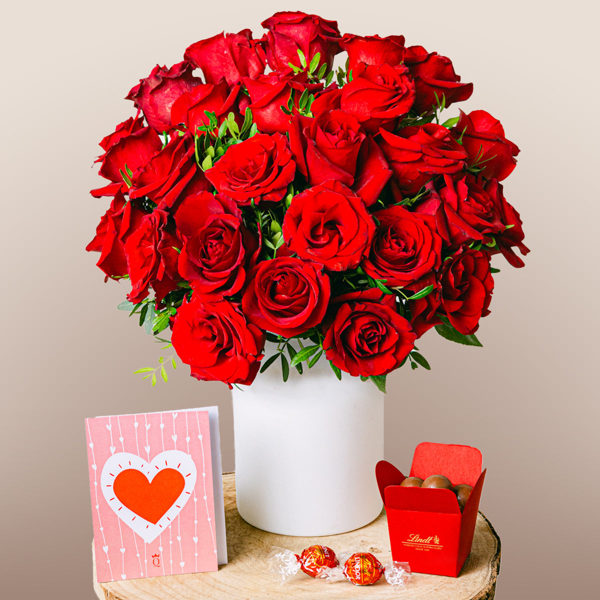 Die tiefroten Rosen, kombiniert mit eleganten Lilien und Nelken, symbolisieren Leidenschaft und ewige Liebe. Perfekt, um Ihre tiefsten Gefühle auszudrücken und einen unvergesslichen Eindruck zu hinterlassen.