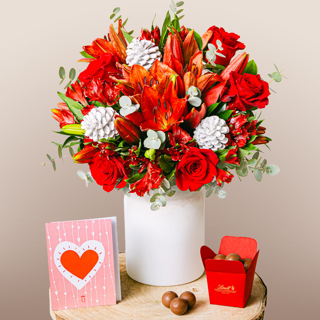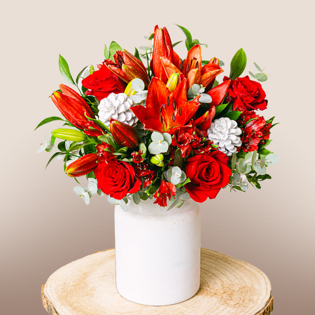 Dieser elegante Strauß setzt ganz auf Rot, die klassische Glücksfarbe. Lilien, Rosen und Inkalilien werden durch die Tannenzapfen ergänzt und machen diesen Strauß zum perfekten Weihnachtsgeschenk. Verschenken Sie ihn an jemanden in der Ferne, damit er sich wie zu Hause fühlt.