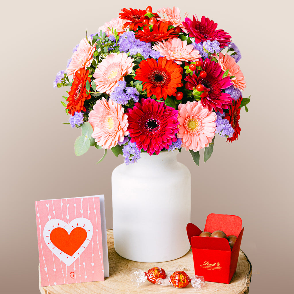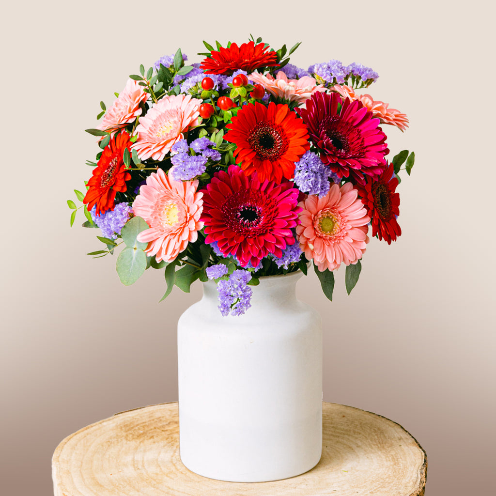 Die Wahl für Menschen mit Leidenschaft. Die intensiven Töne der Gerbera verschmelzen perfekt zu einem Design mit deutlich almodovarischen Untertönen. Dieses Blumenarrangement strahlt Persönlichkeit aus und verleiht jedem Raum eine unbeschwerte Note.