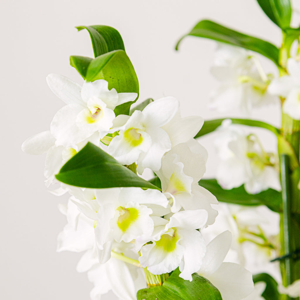 Dendronium, auch Bambusorchidee genannt, ist dank seiner schönen glockenförmigen Blüten und seiner aufrechten Wuchsform eine beliebte Orchideenart. Diese üppige, dichte Pflanze stammt aus tropischen Regenwäldern und ist daher sehr dankbar, wenn Sie ihre Blätter gelegentlich besprühen.