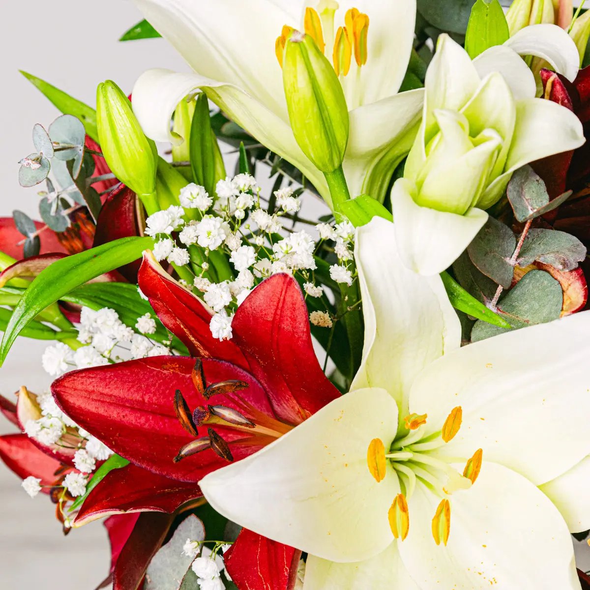 Ein Meisterwerk an Raffinesse und Leidenschaft, eingehüllt in jedes zarte Blütenblatt unserer hochwertigen roten Lilien. Diese sorgfältig aufgrund ihrer Frische und unübertroffenen Qualität ausgewählten Lilien sind ein Symbol tiefer Liebe und aufrichtiger Bewunderung und vermitteln mit ihrem leuchtenden Purpurrot die intensivsten Emotionen. Der Strauß vereint die natürliche Eleganz der Lilien mit einem minimalistischen Design, das ihre natürliche Schönheit unterstreicht. Jede Blüte öffnet sich in perfekter Harmonie und erzeugt einen visuellen Effekt, der jeden Raum in eine Atmosphäre voller Charme und Wärme verwandelt. Dank unseres schnellen und zuverlässigen Lieferservices können Sie Ihre Lieben überall auf der Welt überraschen und ihnen genau im richtigen Moment eine Botschaft der Liebe und Wertschätzung überbringen. Dieser Strauß ist mehr als nur ein Detail: Er ist Ausdruck tiefer Gefühle, ein visuelles und sinnliches Erlebnis, das in Erinnerung bleibt.