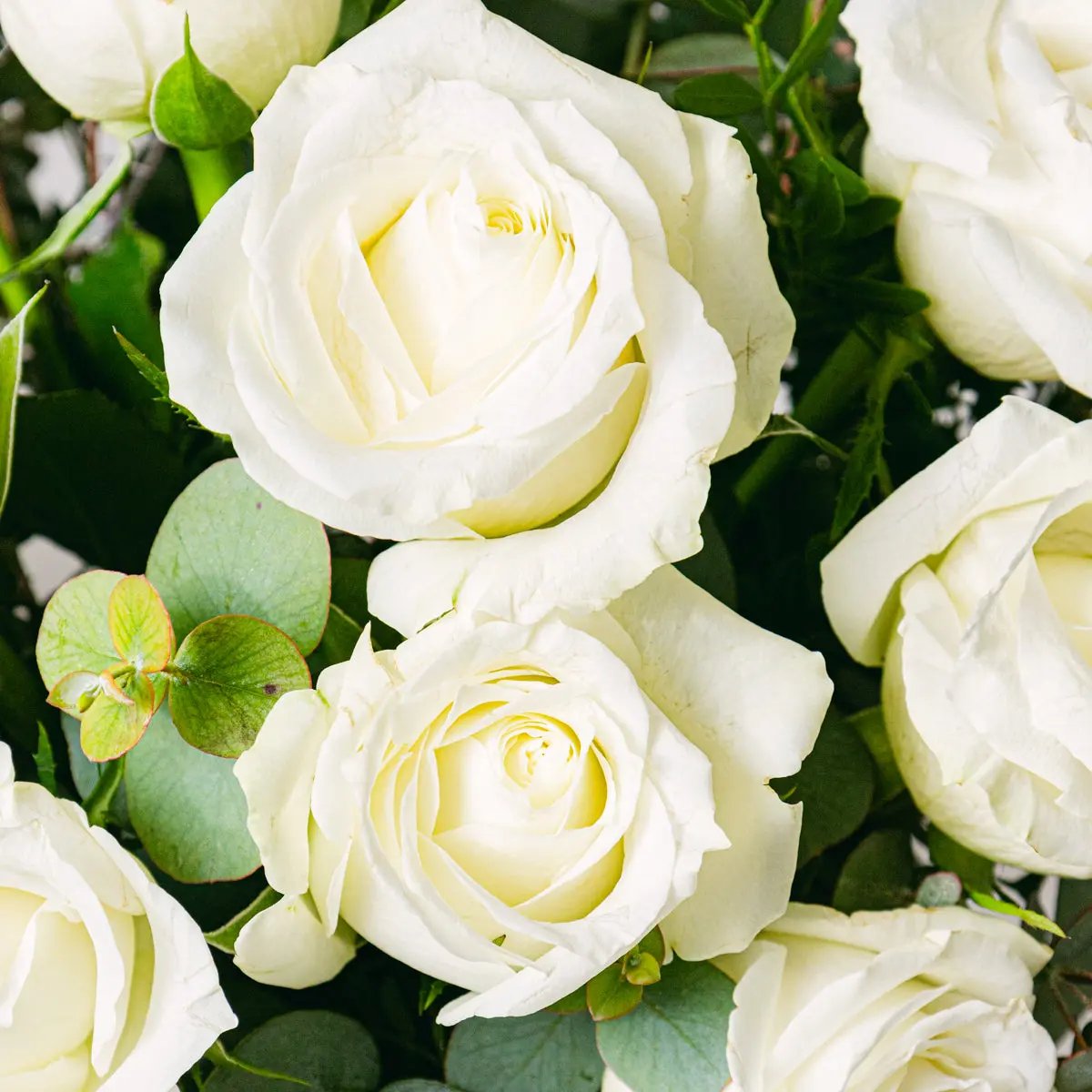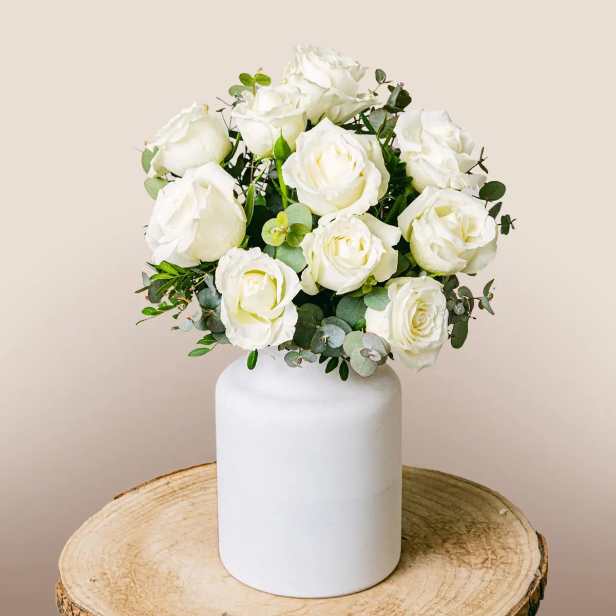 Die Kombination aus weißen Rosen und Eukalyptus schafft ein Gefühl von Ruhe und Frieden. Die schlichte Eleganz dieses Straußes macht ihn zu einem passenden Geschenk für zahlreiche Anlässe, von Geburtstagen bis zu Dankesbekundungen.