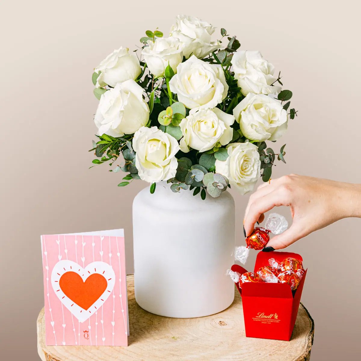 Erleben Sie die Eleganz und Ruhe unseres Straußes, der jedem Ambiente Ruhe und Anmut verleiht. Weiße Rosen, weltweit bekannt als Symbole für Reinheit, Unschuld und Neubeginn, bilden das Herzstück dieses atemberaubenden Arrangements. Jede Rose wird sorgfältig aufgrund ihrer makellosen Form und ätherischen Schönheit ausgewählt und erzeugt eine Aura der Ruhe und Eleganz. Zusammen mit zarten Eukalyptuszweigen, die Schutz und Fülle symbolisieren, strahlt dieser Strauß eine frische und belebende Harmonie aus – perfekt, um die besonderen Momente des Lebens zu feiern. Ob als Zeichen tiefer Wertschätzung, als Glückwunsch oder einfach nur, um jemandem den Tag zu verschönern – diese Blüten wecken garantiert Freude und Bewunderung. Weiße Rosen heben bekanntlich die Stimmung und zaubern dem Empfänger ein Lächeln ins Gesicht. Das Arrangement ist sorgfältig als Herzstück konzipiert, das nicht nur einen Raum verschönert, sondern auch eine emotionale Resonanz hervorruft, was es zu einem idealen Begleiter für herzliche Botschaften und bedeutende Ereignisse macht.