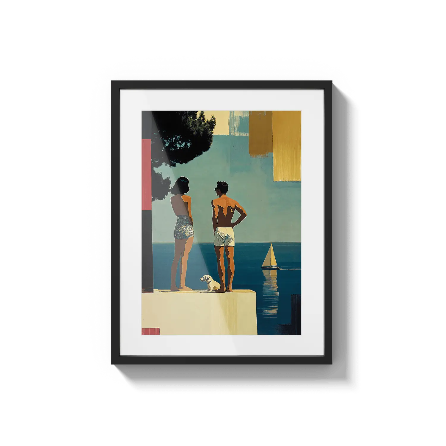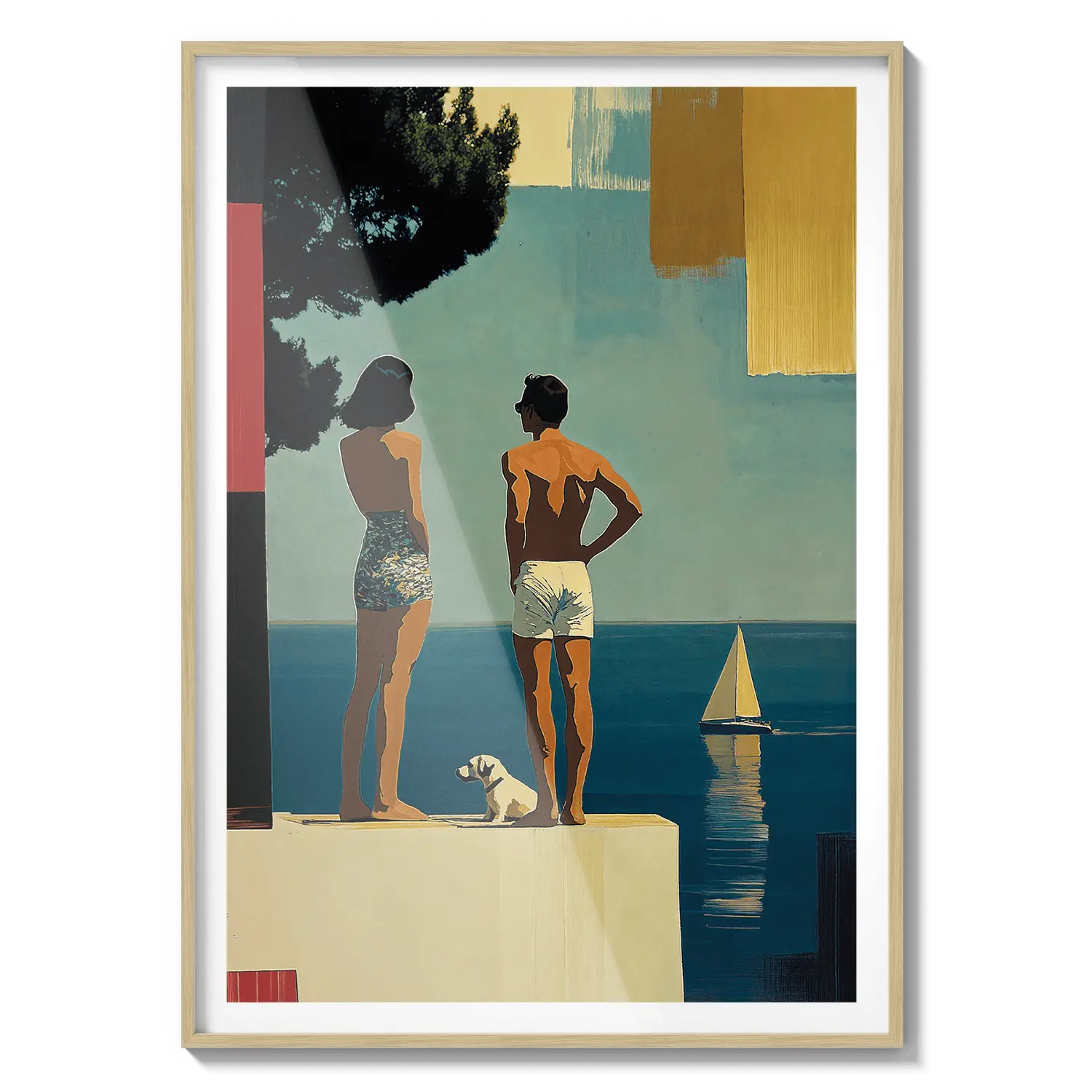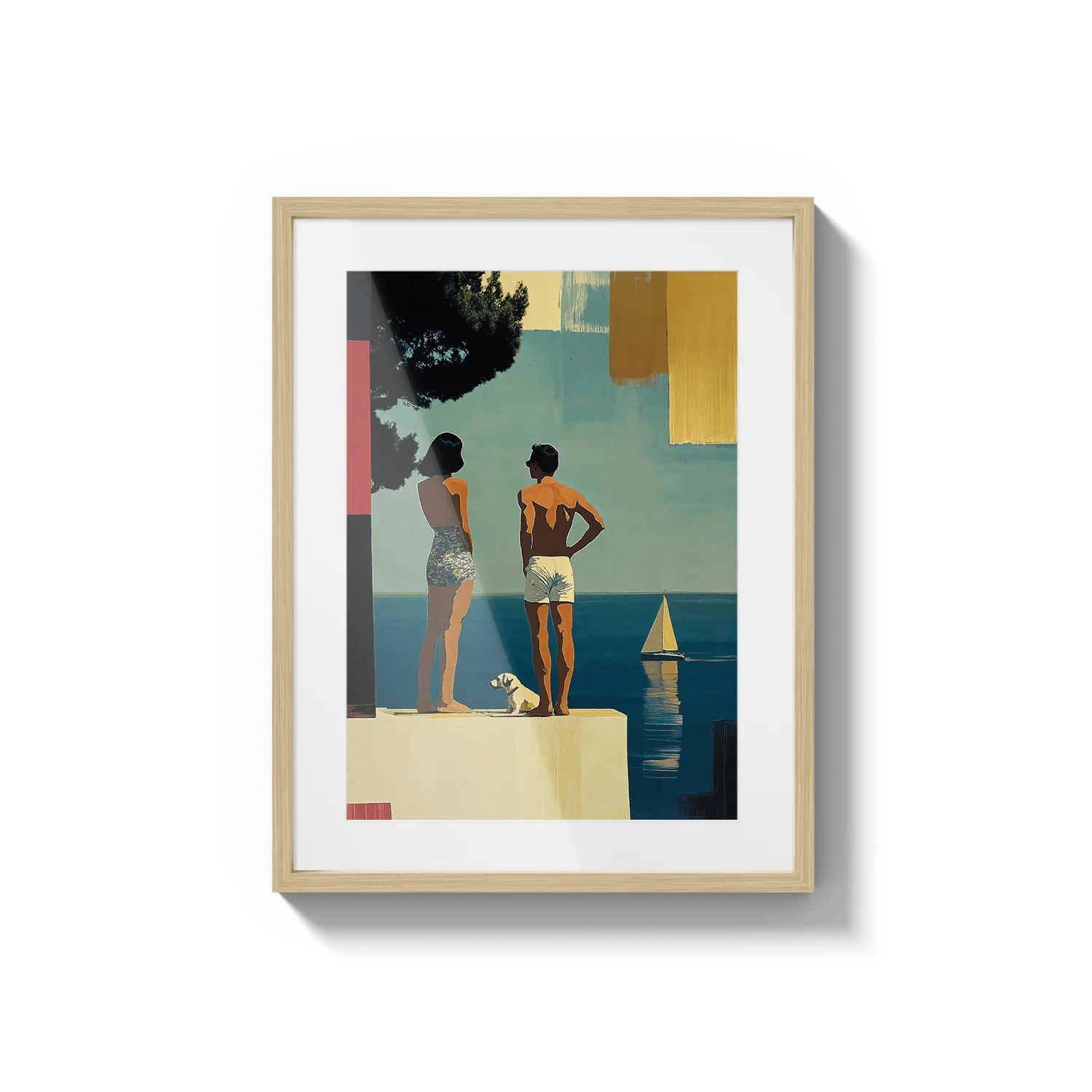 Eine sonnige Küstenszene mit Figuren, die am Meer unter warmem Licht stehen. Eine sanfte Einladung, innezuhalten und durchzuatmen.
