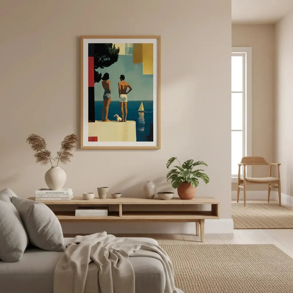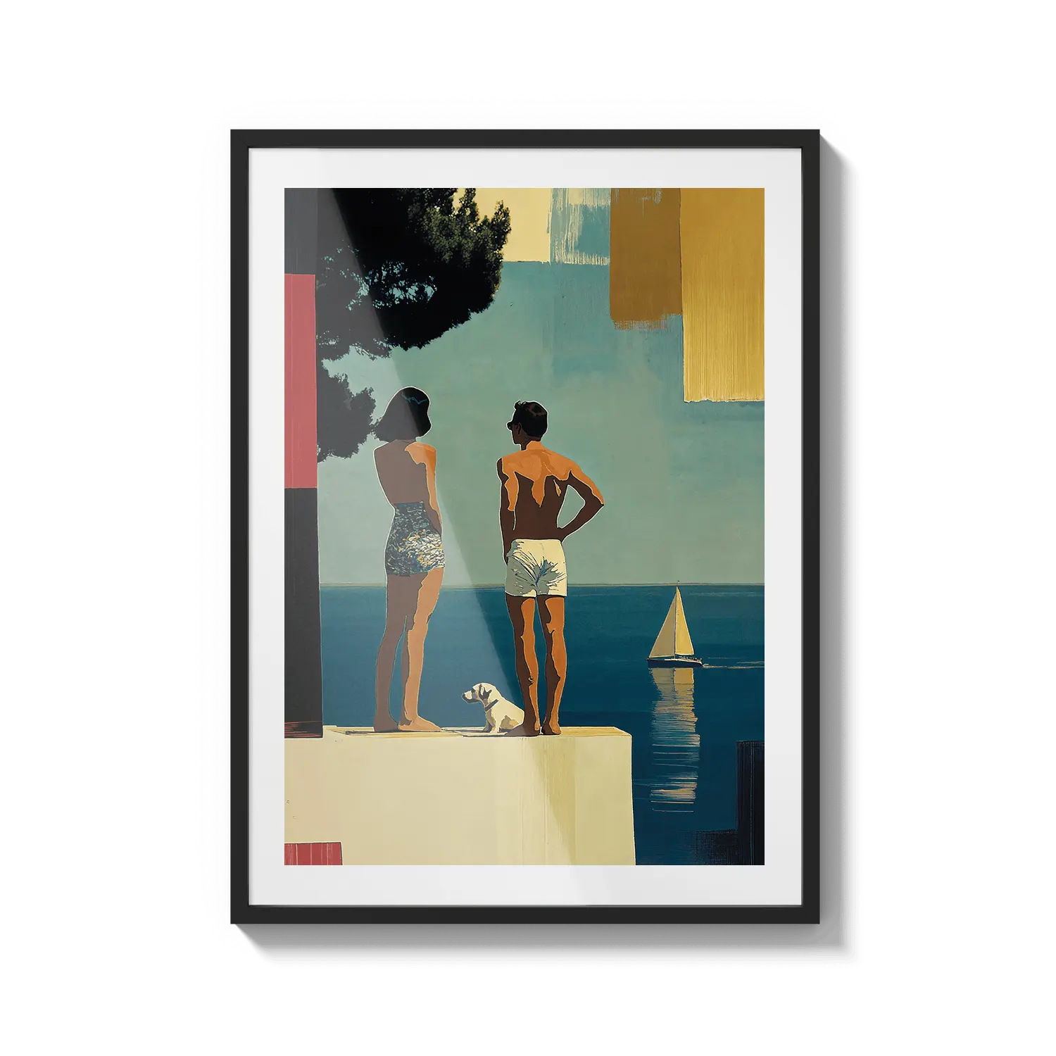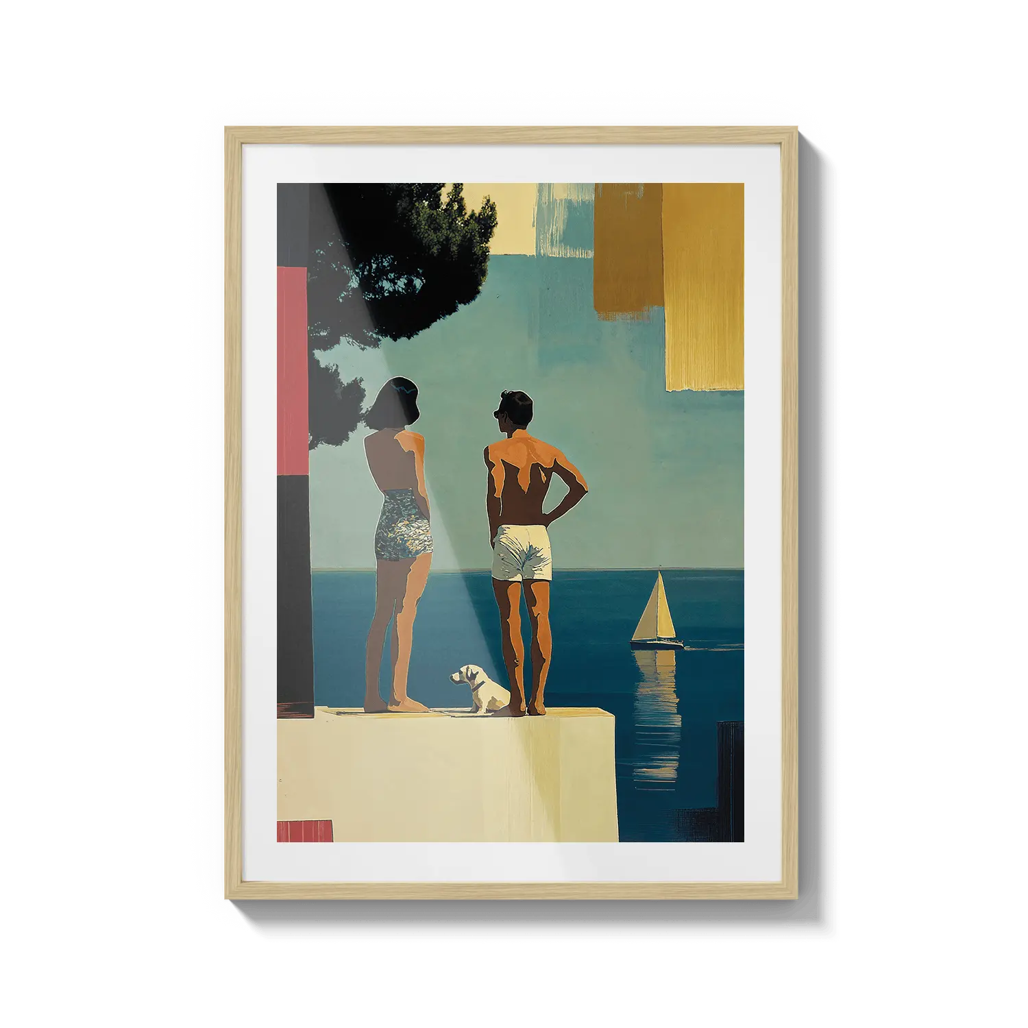 Eine sonnige Küstenszene mit Figuren, die am Meer unter warmem Licht stehen. Eine sanfte Einladung, innezuhalten und durchzuatmen.