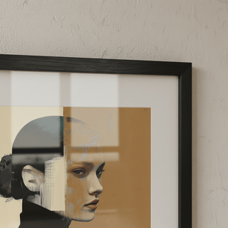 Ein modernes Porträt mit kräftigen Formen und gedämpften Tönen, das Selbstbeobachtung und stille Stärke widerspiegelt. Ein raffiniertes und bedeutungsvolles Geschenk.