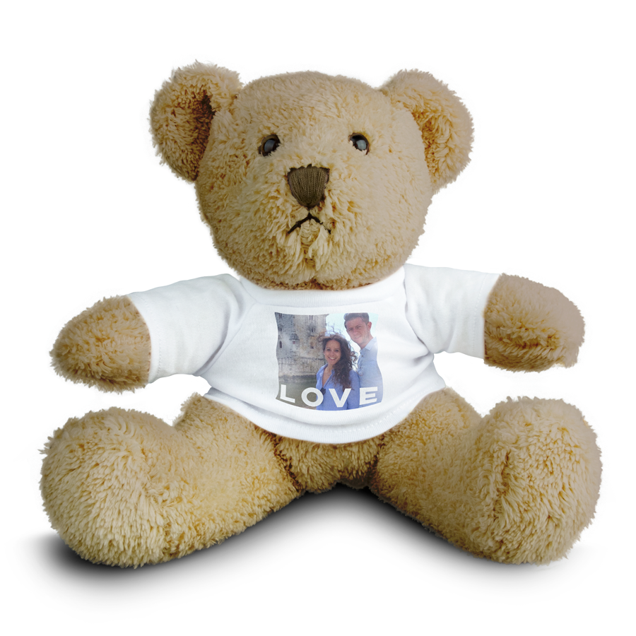 Billy Bear ist ein kuscheliger Teddybär, der ein personalisiertes T-Shirt mit Ihrem eigenen Foto und Text trägt!