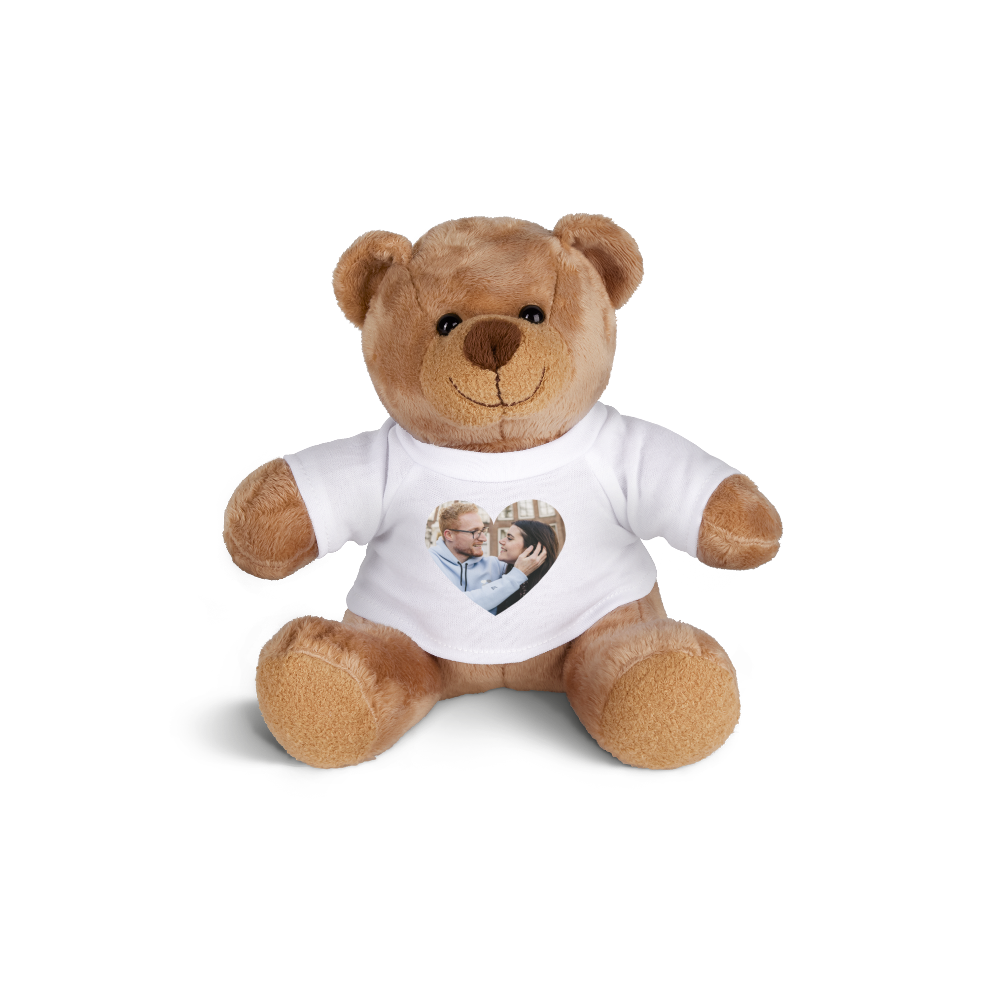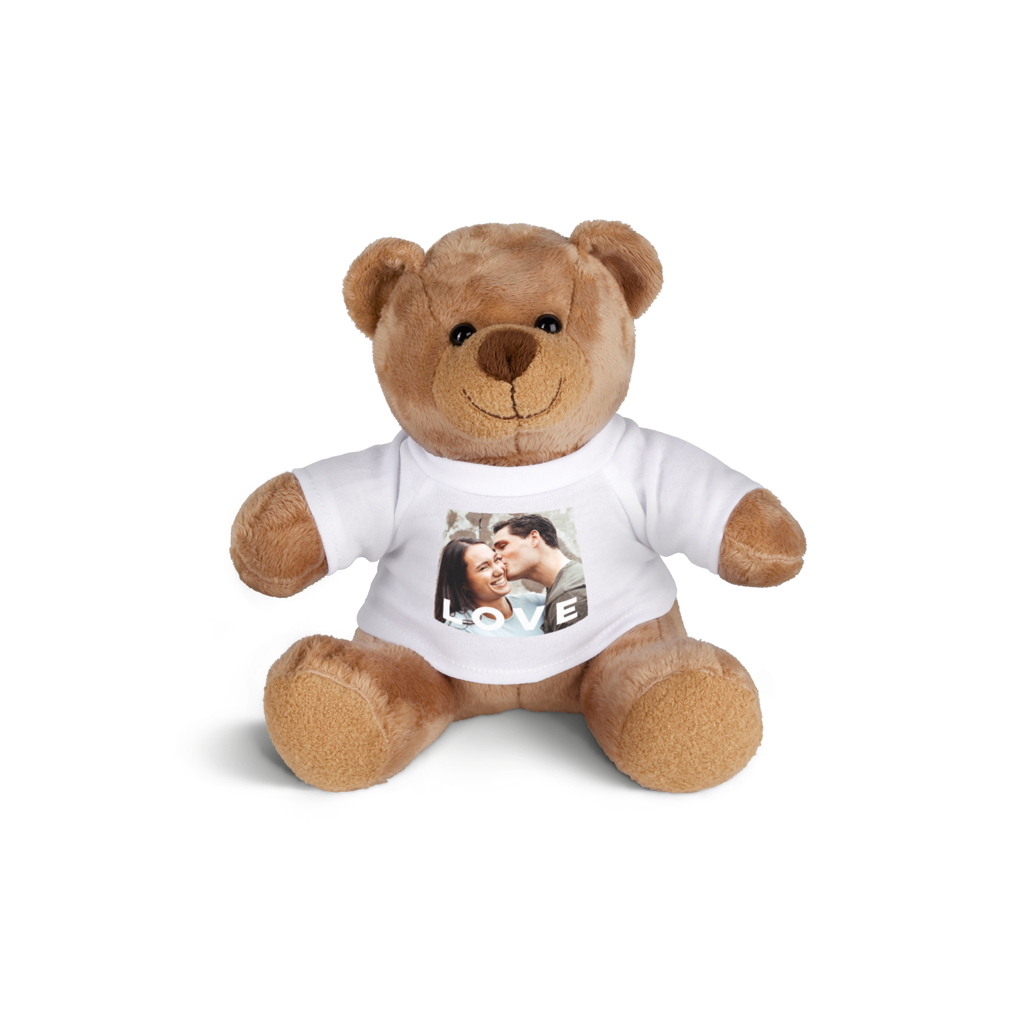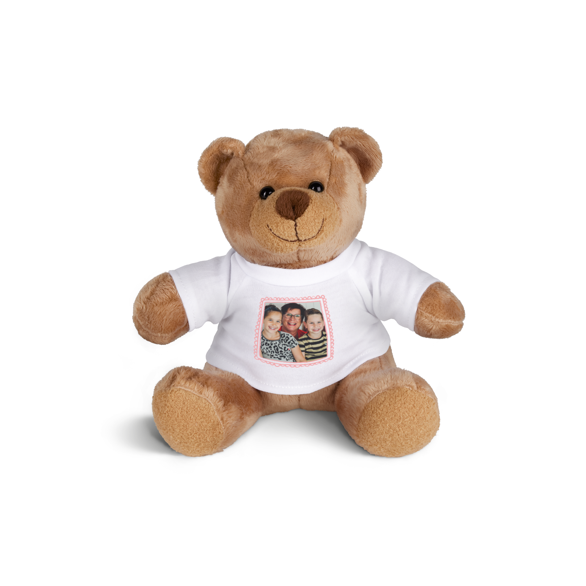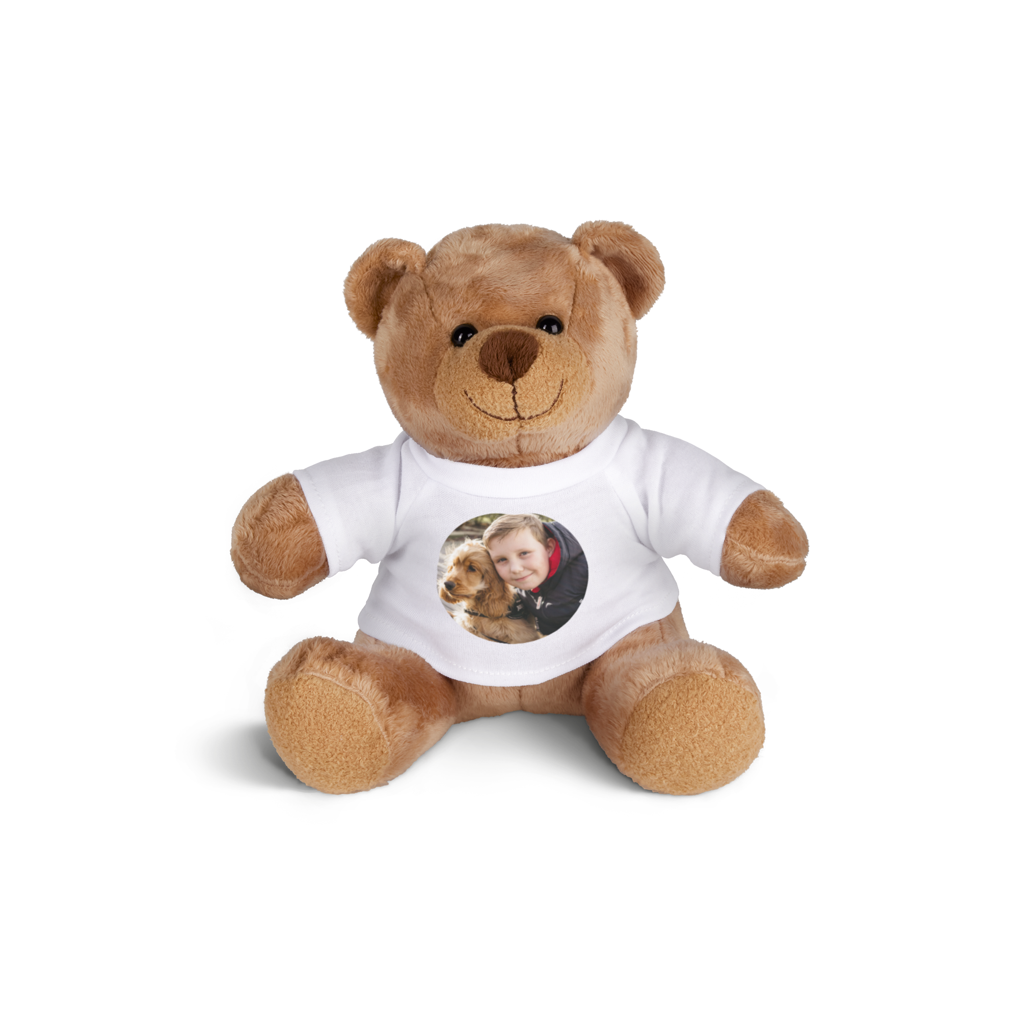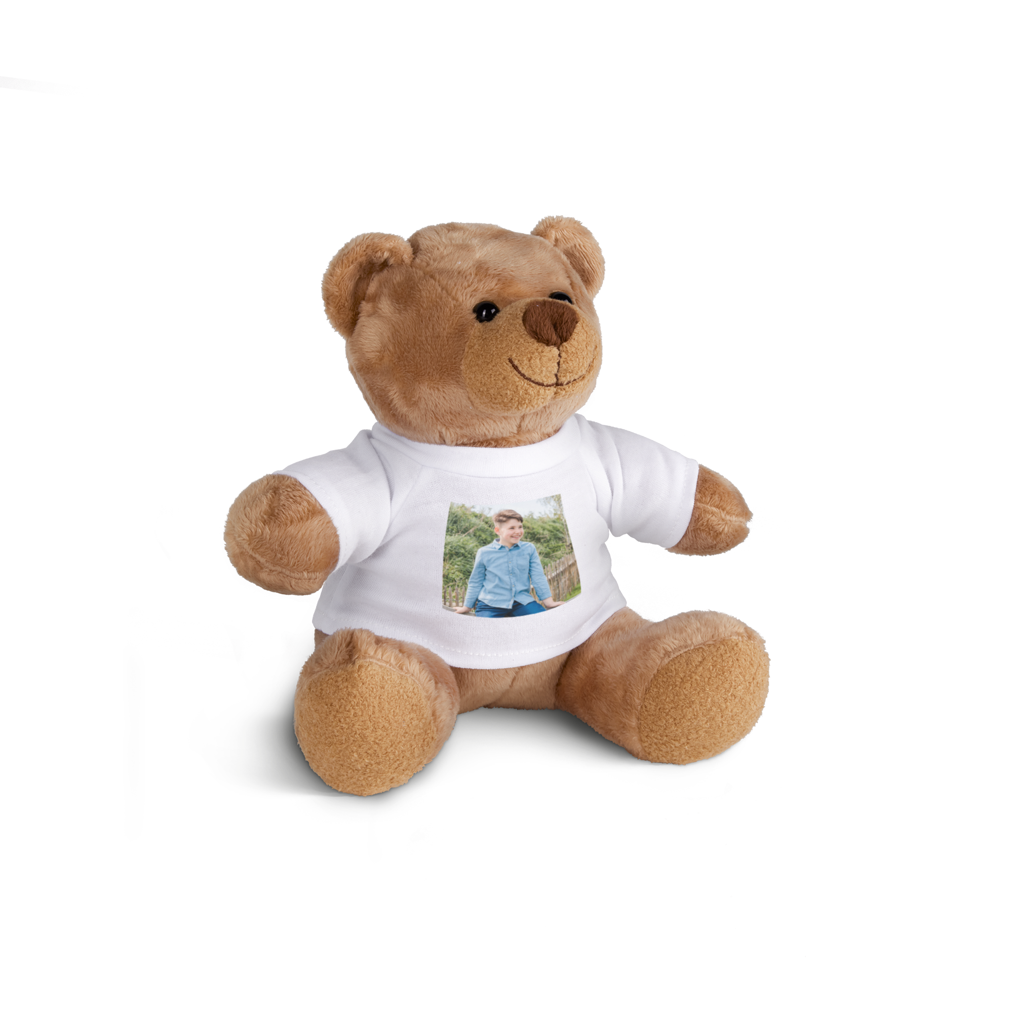 Benjamin Bär ist ein kuscheliger Teddybär, der ein personalisiertes T-Shirt mit Ihrem eigenen Foto und Text trägt!