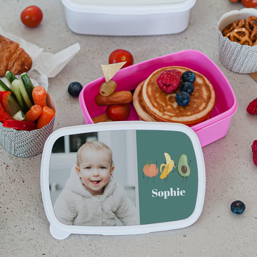 Eine personalisierte Lunchbox mit Namen, Foto oder Text. In verschiedenen Farben erhältlich.