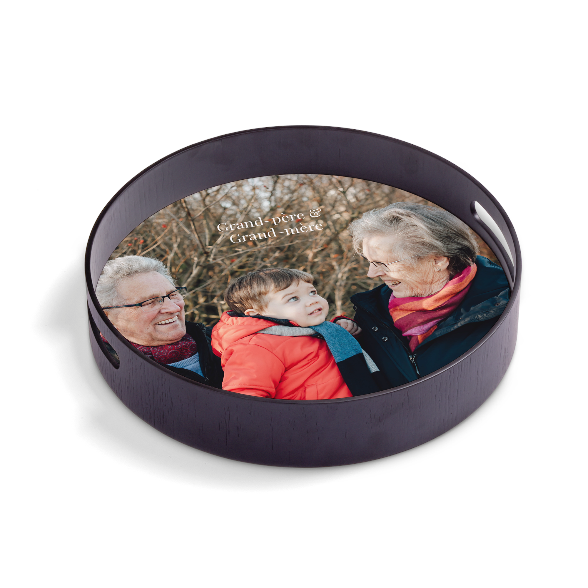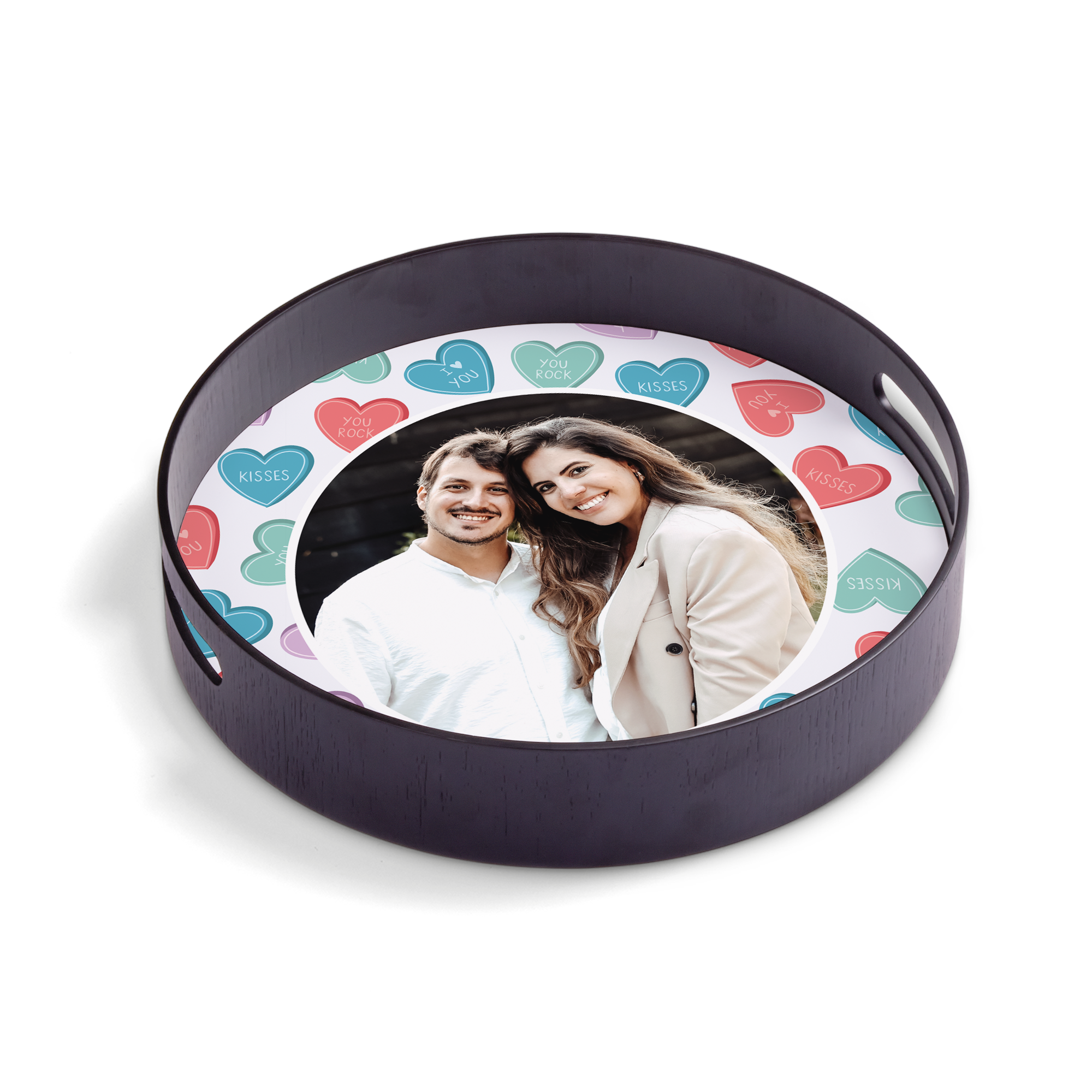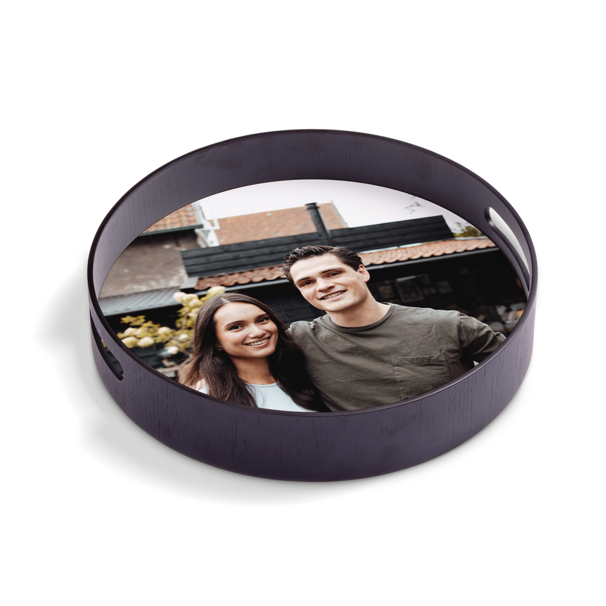 Mehr Informationen zum personalisierten Serviertablett:Form: rundFarbe: schwarzMaterial: Deluxe-Holzrahmen (Kiefernholz) mit Basis aus hochwertiger HartfaserplatteOberfläche: glänzendMaße: 30 x 30 x 5 cmPersonalisierung: mit Foto, Namen, Logo oder CollageDruck: gestochen scharf und in Vollfarbe