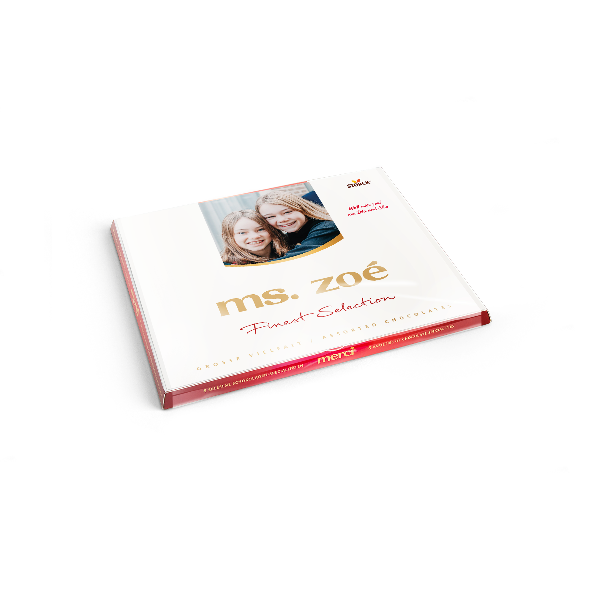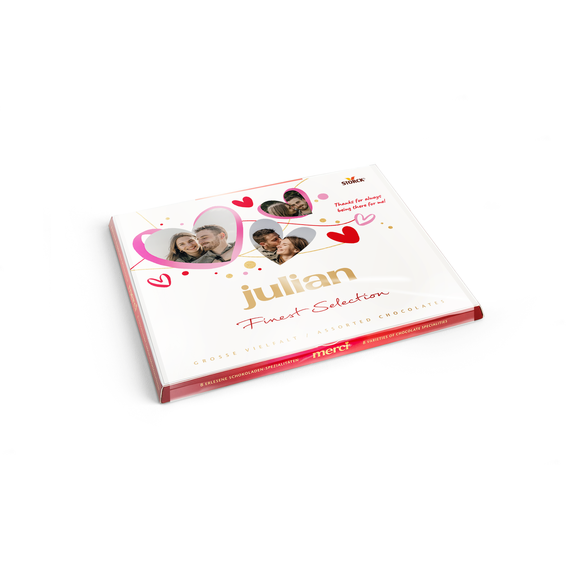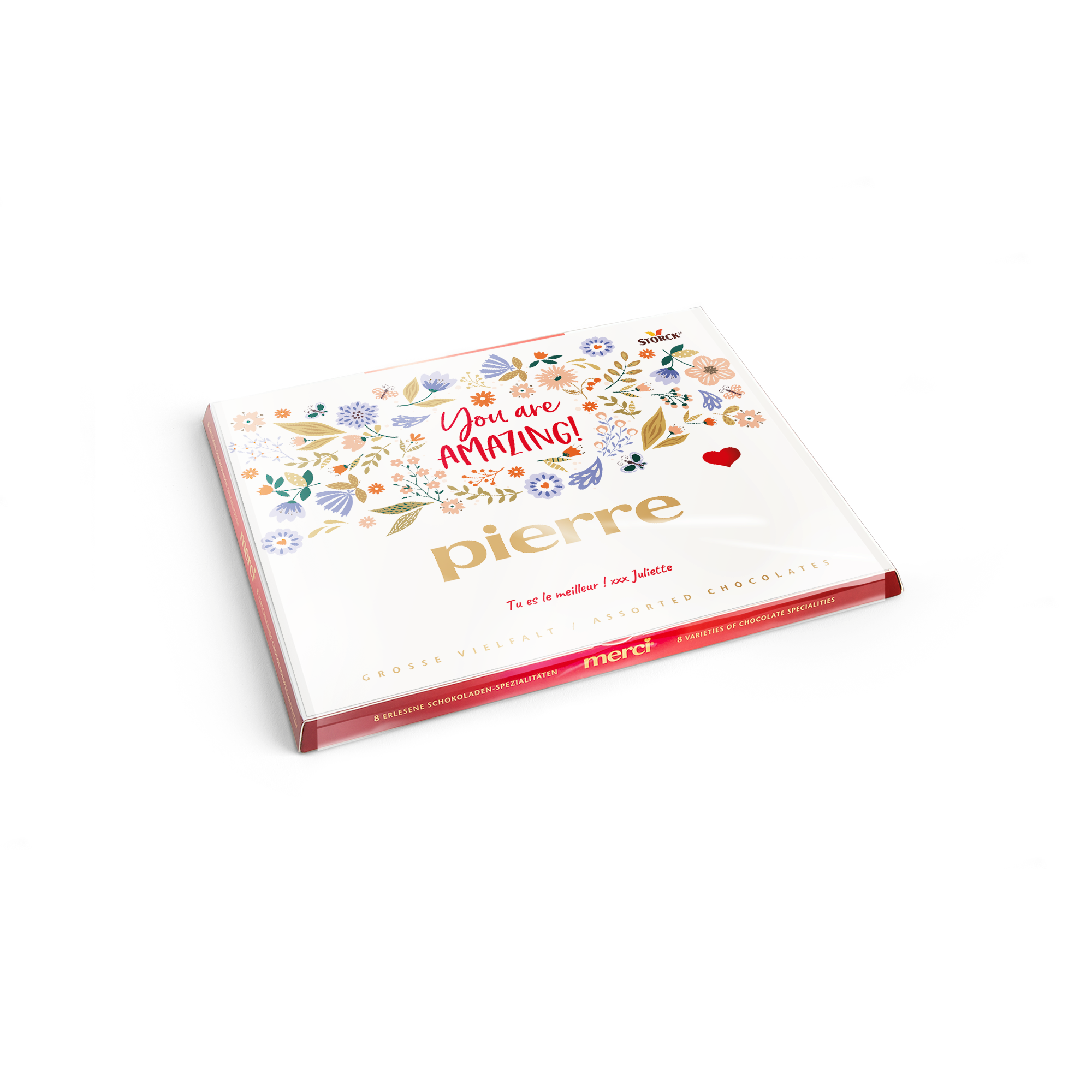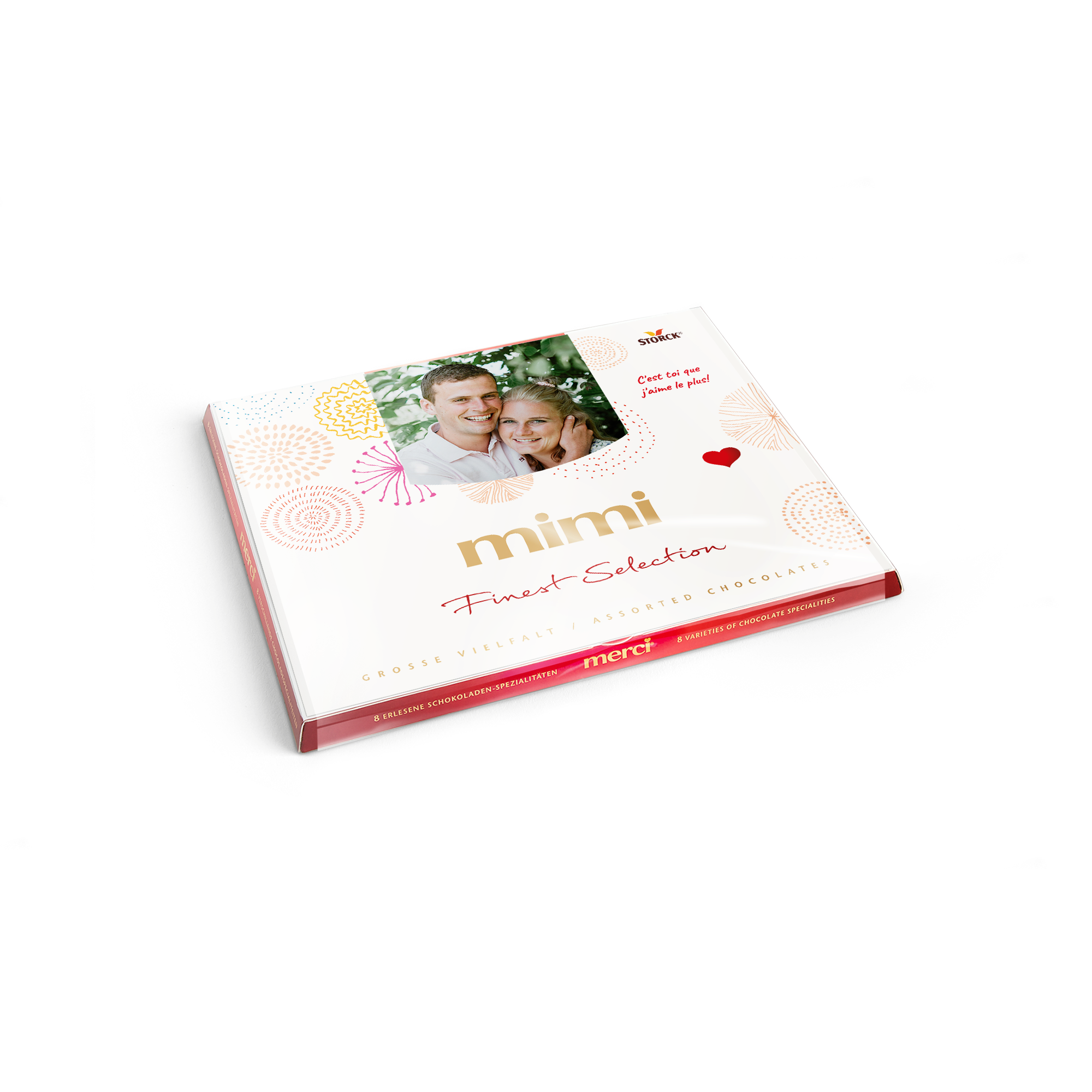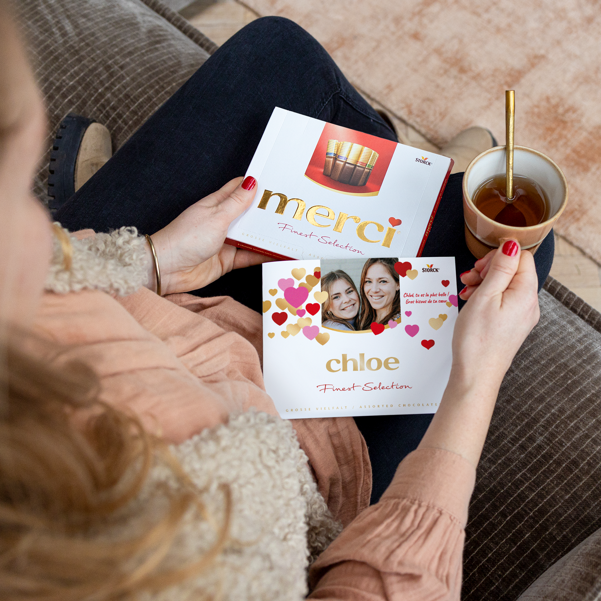 Eine Merci Pralinenschachtel mit einer personalisierten Karte mit Foto, Namen und/oder Text Ihrer Wahl. Klassisches Merci-Design!