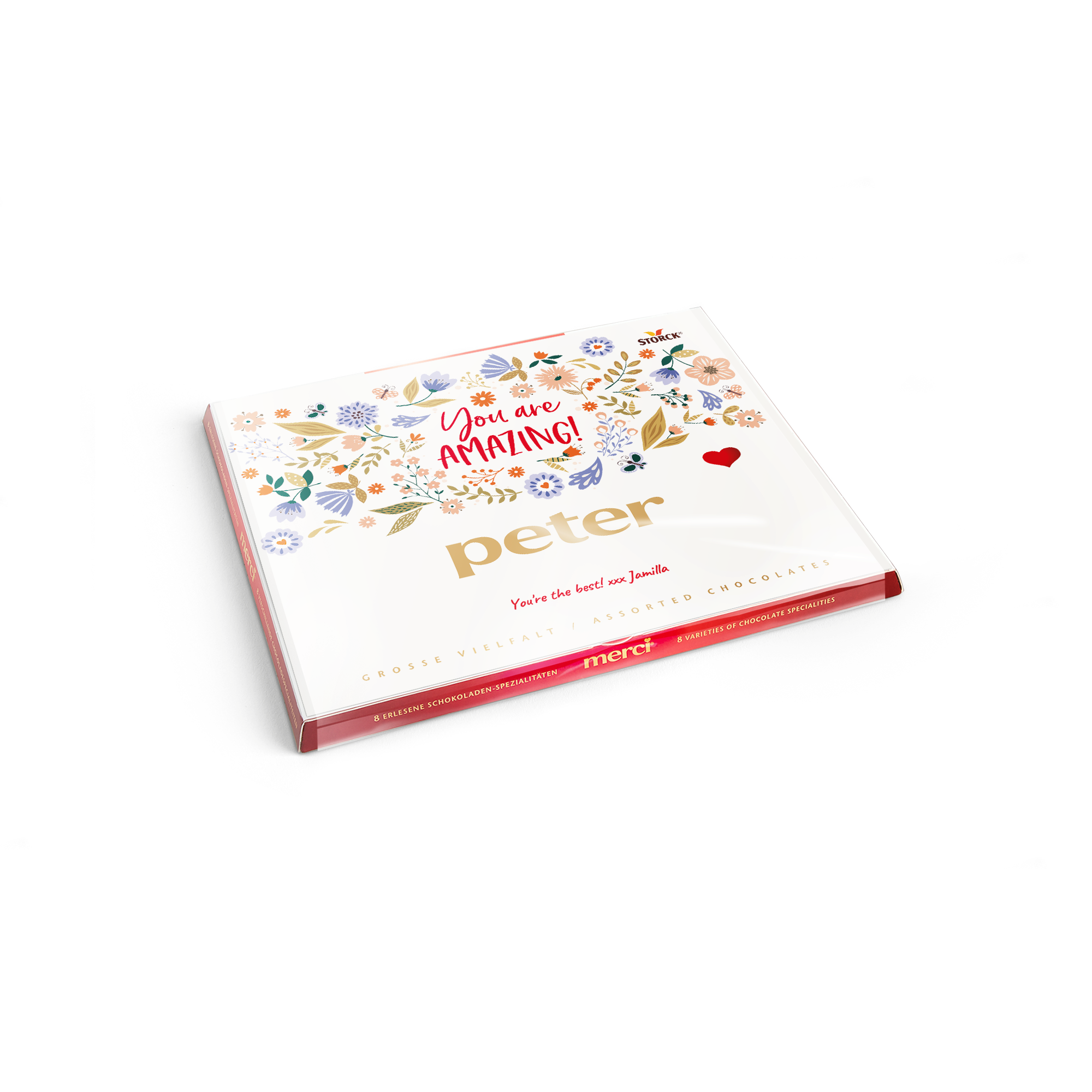 Mehr Informationen zur Merci Schokolade: Schokolade: Ein Mix aus Milchschokolade, Milchnougat, Mandel-Haselnuss-Schokolade, Haselnuss-Nougat, Zartbitterschokolade, Mokkacreme, Zartbittermousse, MarzipanAnzahl Pralinen: 20Gewicht: 250 GrammMaße der Schachtel: 19,5 x 16 x 1,5 cmMaße der Karte gefaltet: 18,5 x 14,8 cmPersonalisierung: mit Namen, Foto und persönlicher NachrichtDruck: gestochen scharf und in VollfarbeBei Außentemperaturen von 25 Grad Celsius oder mehr können wir für die Qualität der Schokolade keine Garantie übernehmen. Bei Fragen zu Ihren Schokoladenbestellungen wenden Sie sich bitte an unseren Kundenservice. Aus technischen Gründen ist die Verwendung von kyrillischen, türkischen, asiatischen, arabischen, griechischen oder Sonderzeichen nicht möglich.