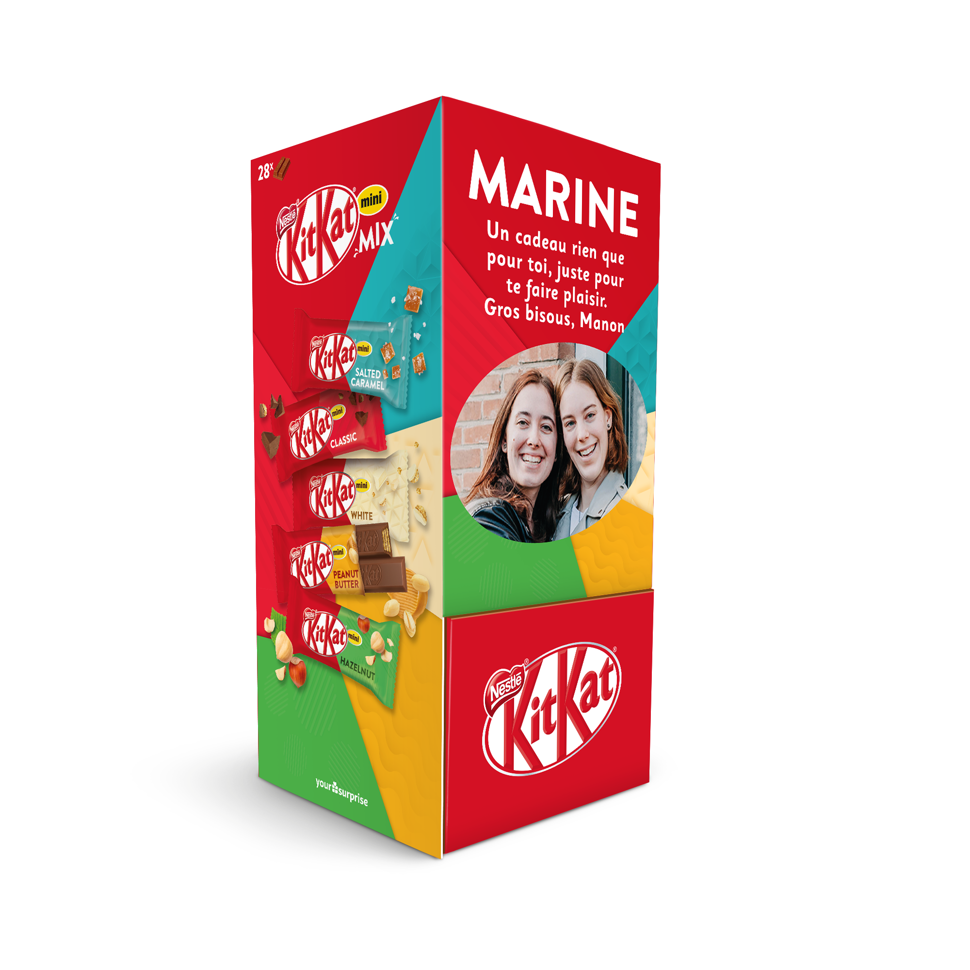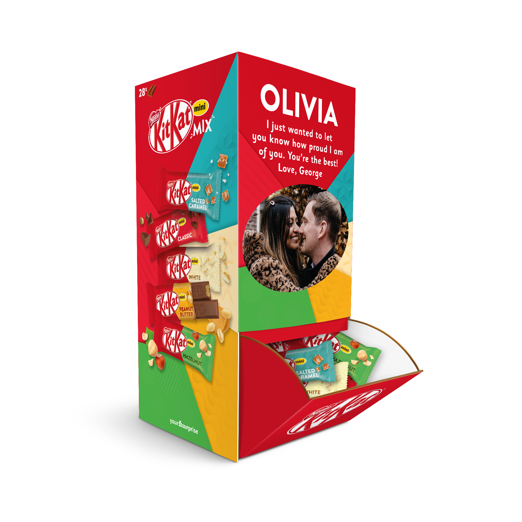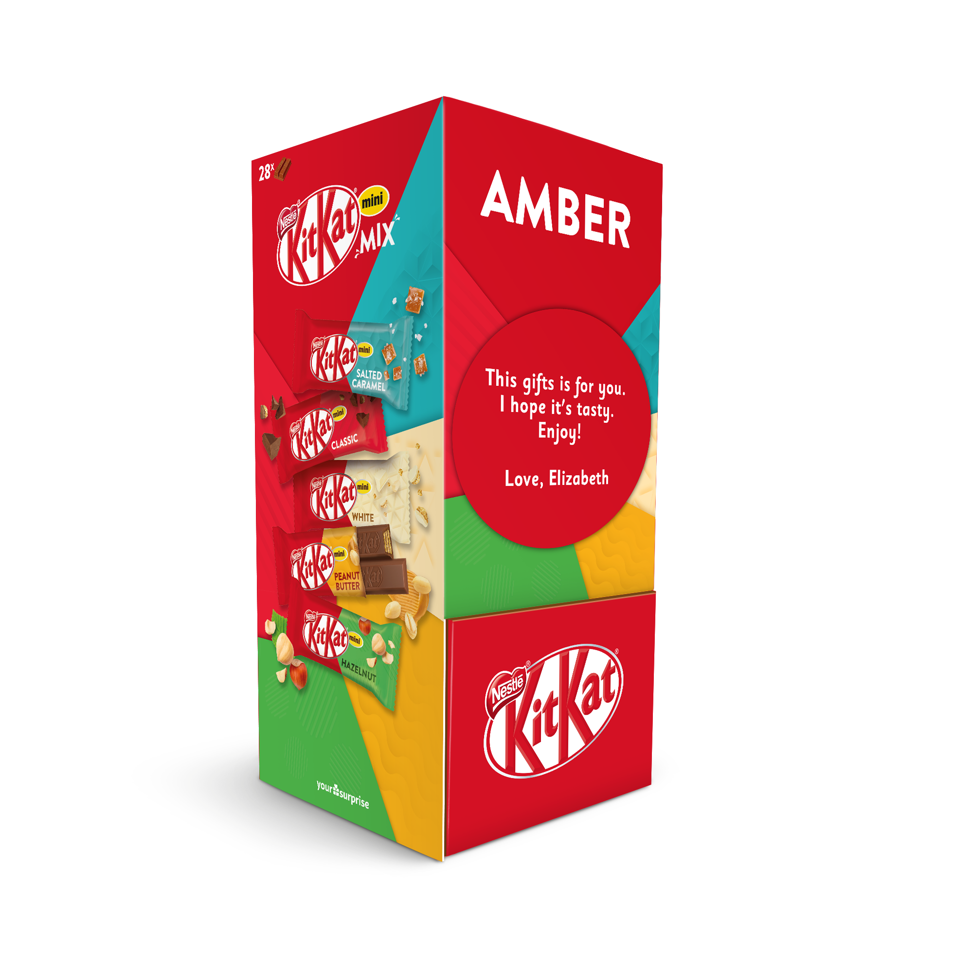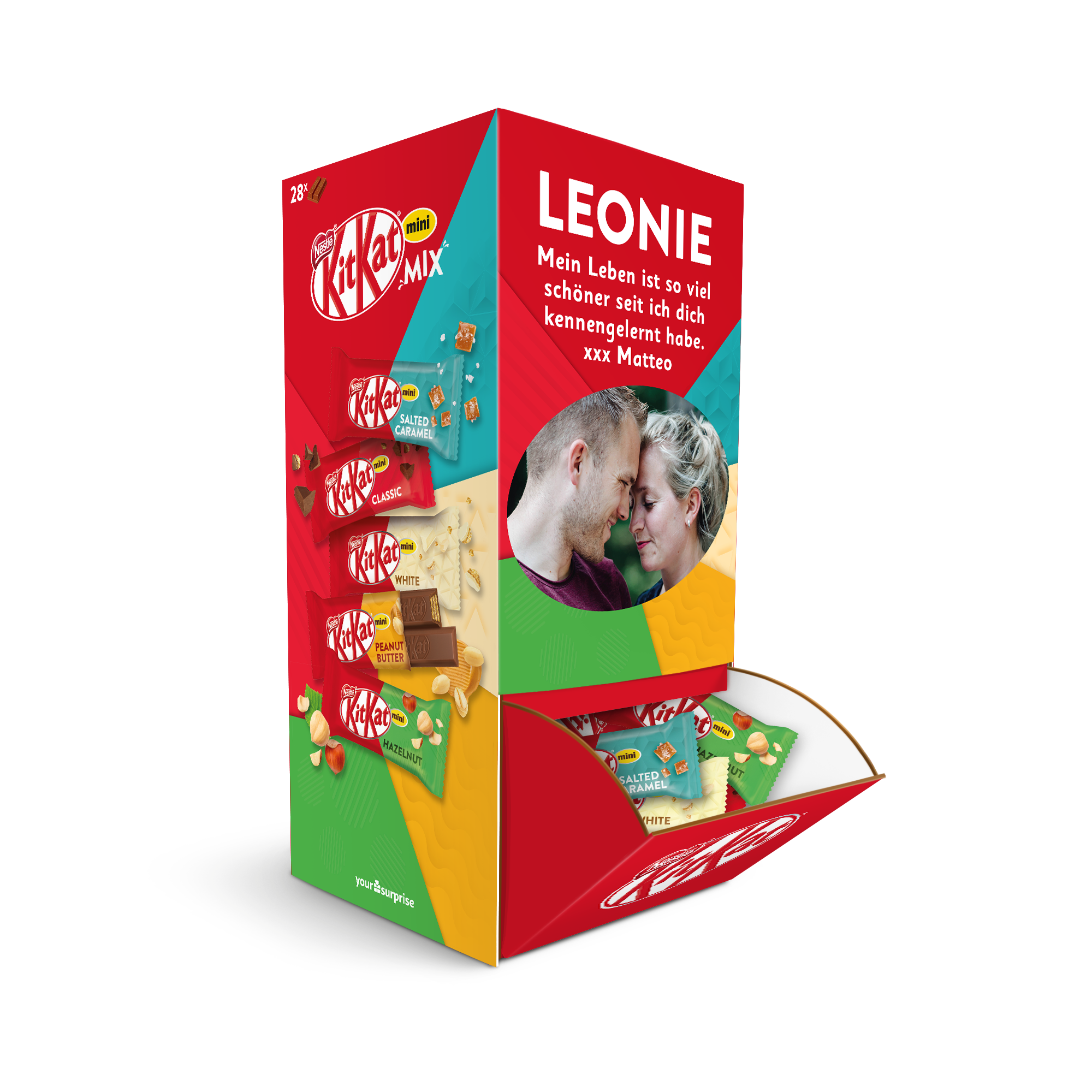 Die KitKat Mini Mix Geschenkbox enthält 28 Pralinen in 5 verschiedenen Geschmacksrichtungen und kann mit Ihrem Foto und/oder Wunschtext personalisiert werden!
