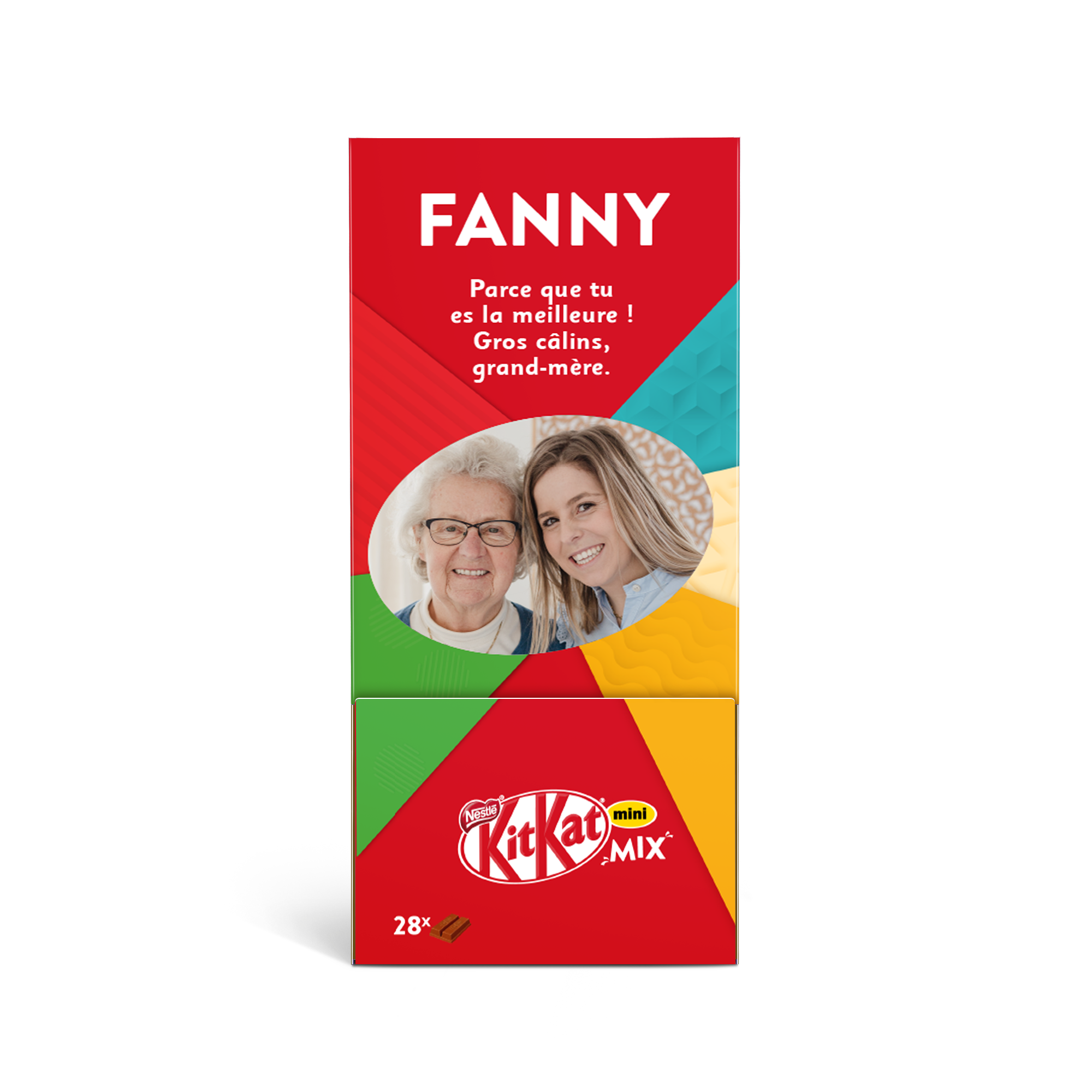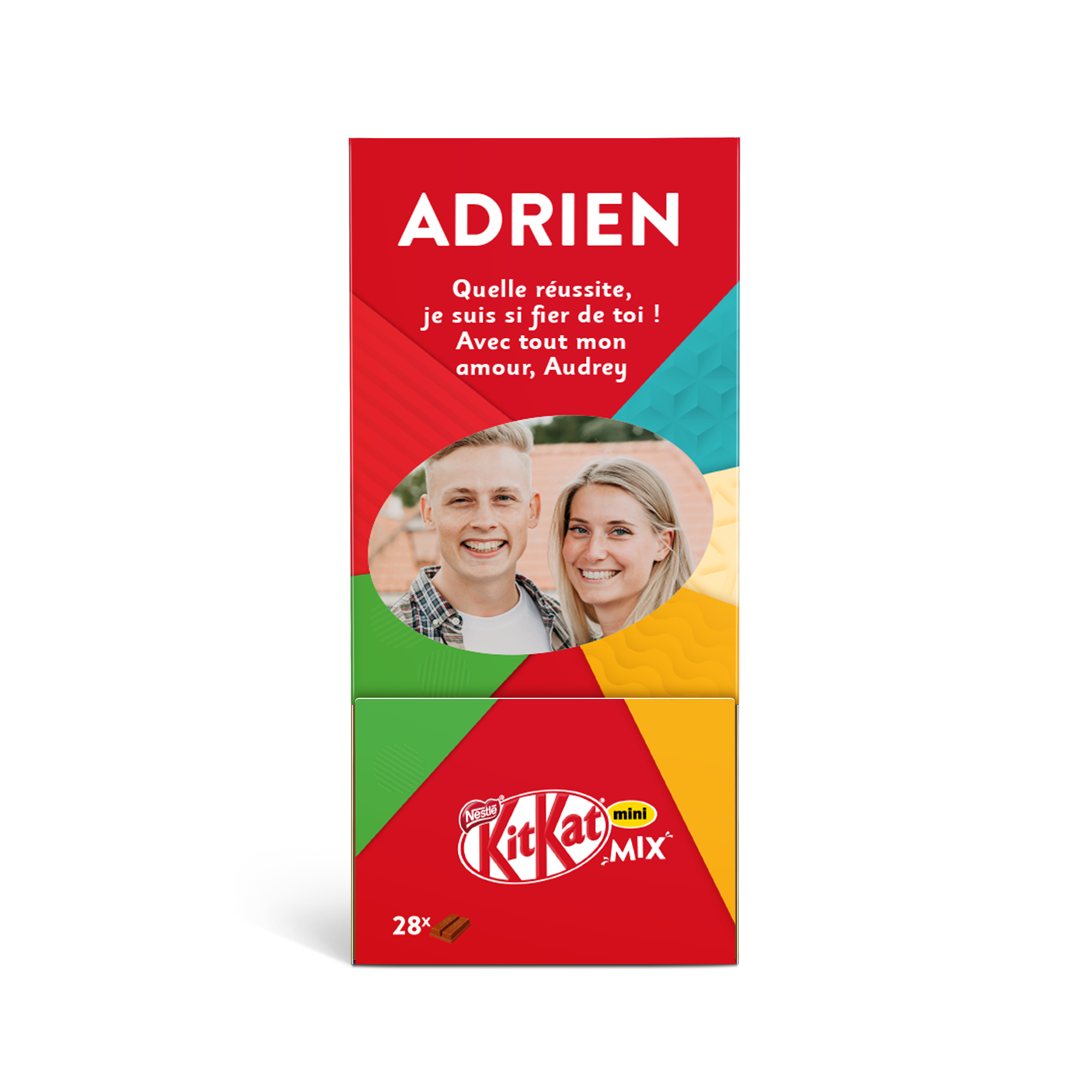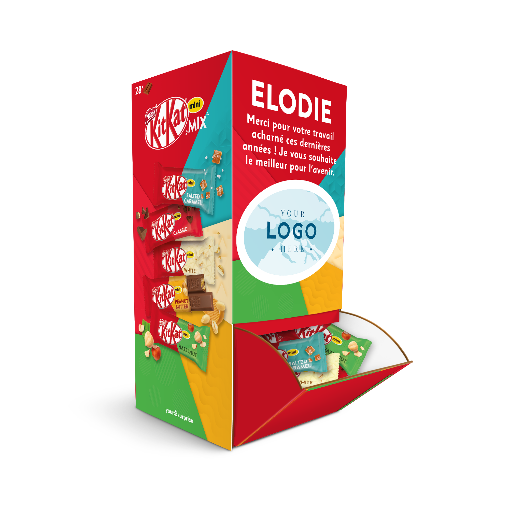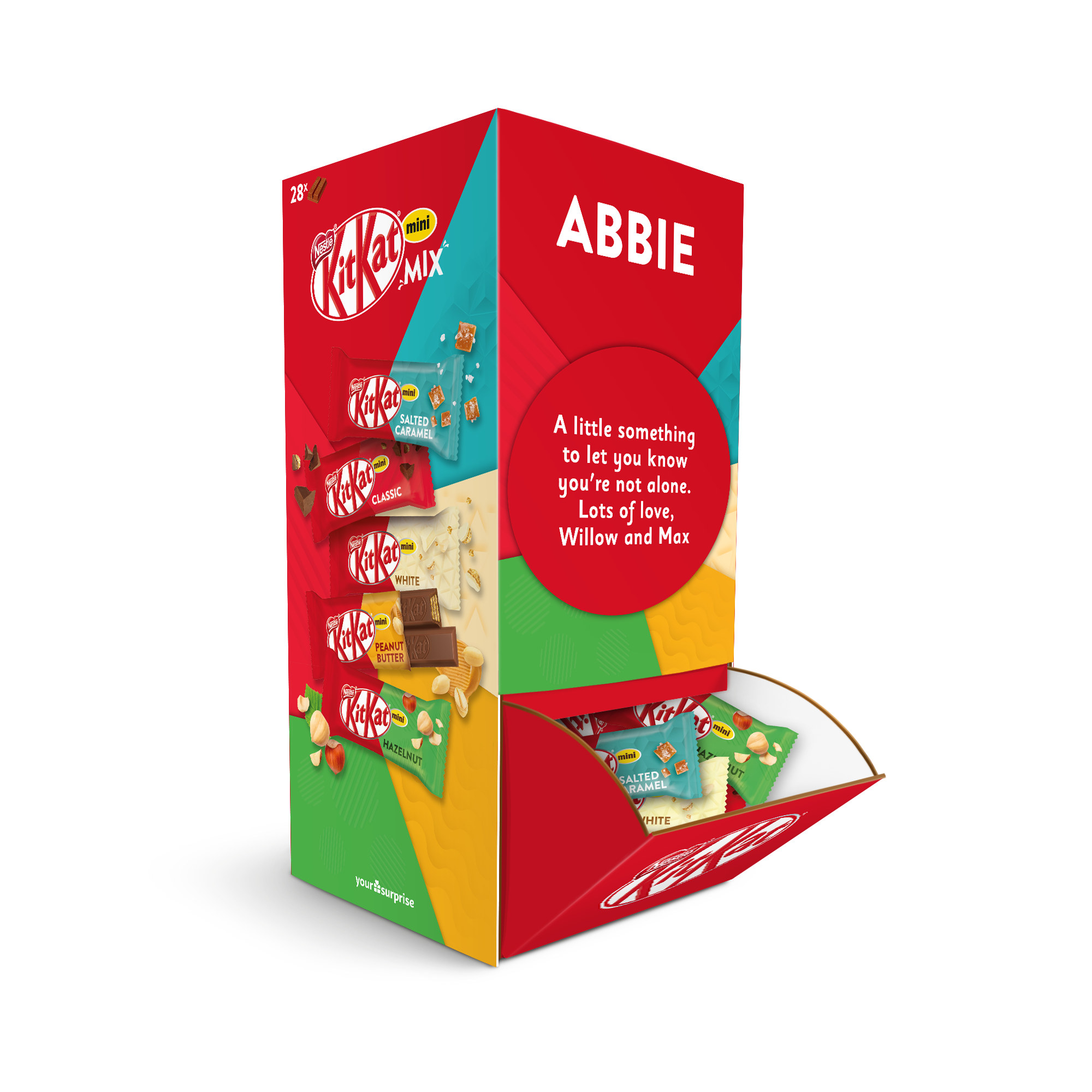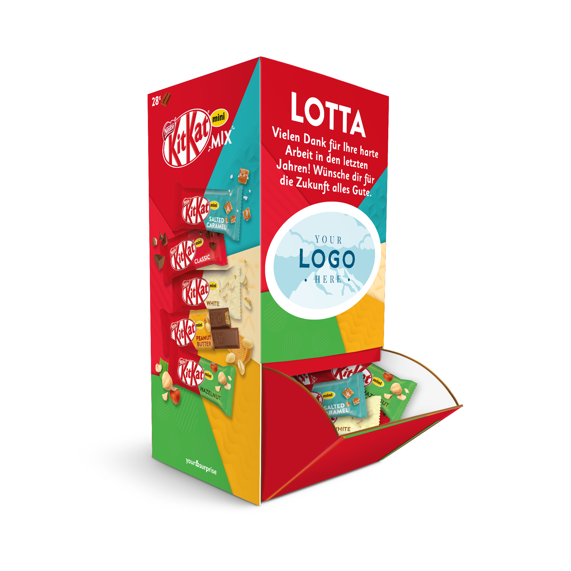 Die KitKat Mini Mix Geschenkbox enthält 28 Pralinen in 5 verschiedenen Geschmacksrichtungen und kann mit Ihrem Foto und/oder Wunschtext personalisiert werden!