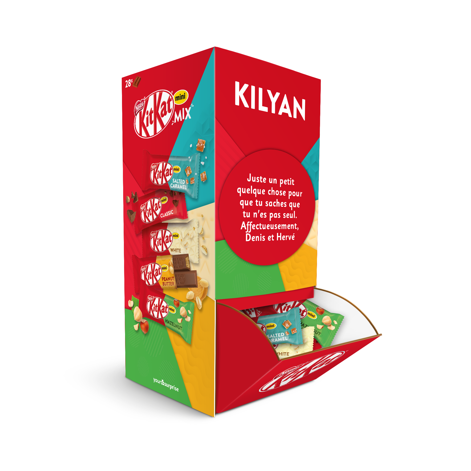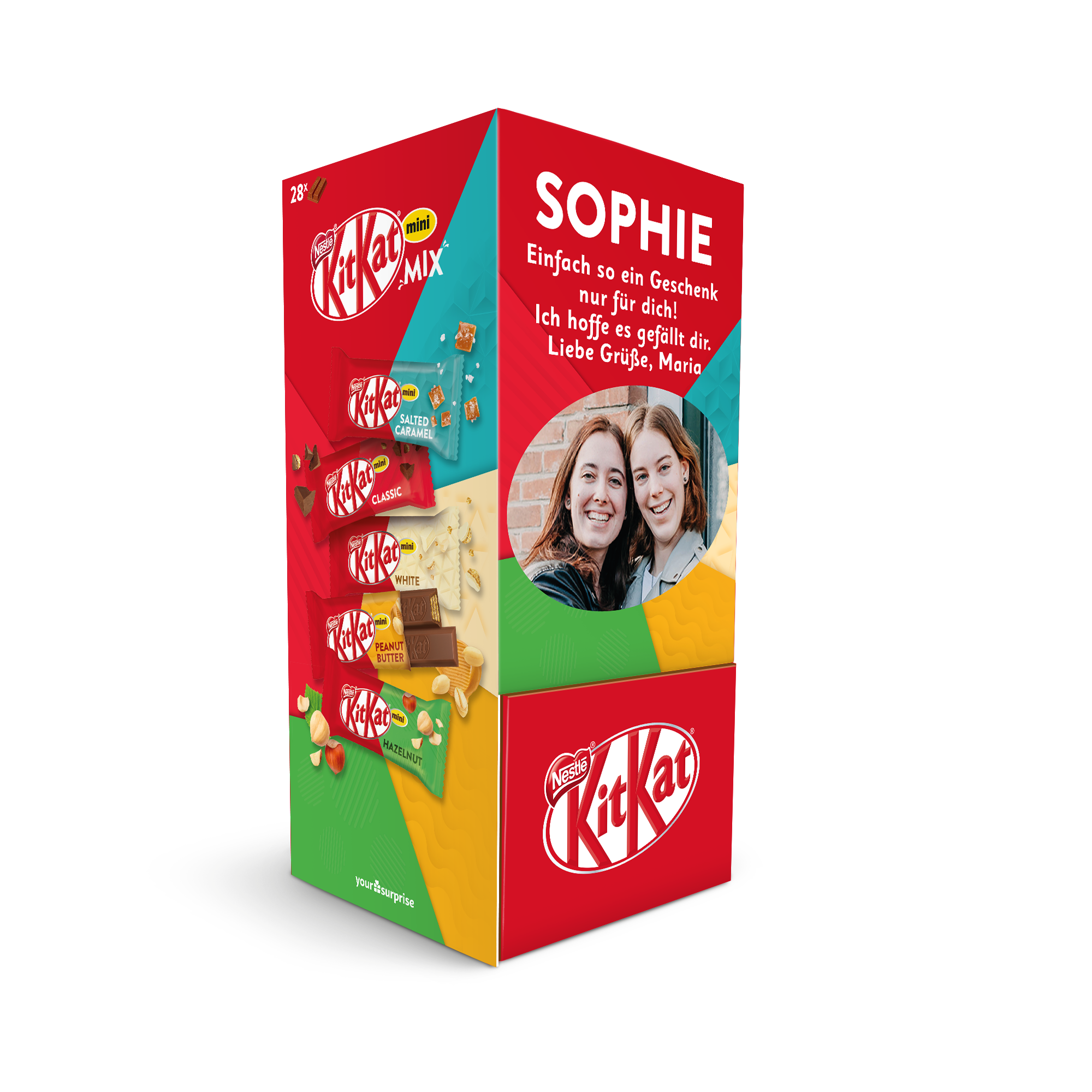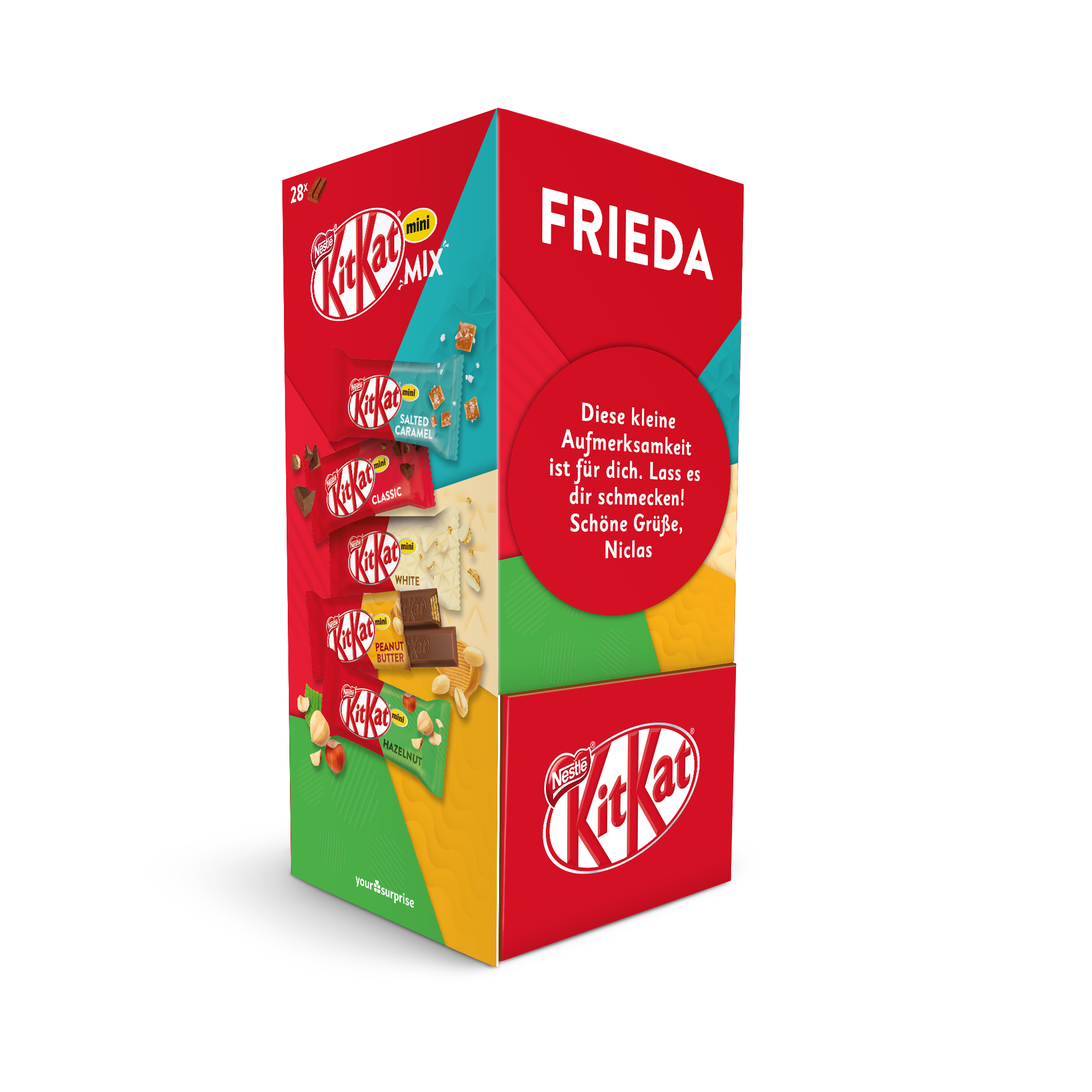 Mehr Informationen zur KitKat Mini Mix Geschenkbox:Maße der Box: 23 x 10,6 x 10,6 cmInhalt: 28 Stück (394,8 Gramm)Gewicht: 475 GrammPersonalisierung: Name, Foto und/oder TextAufdruck: gestochen scharf und in VollfarbeZusätzliche Informationen: Kühl und trocken lagern. Bitte beachten Sie, dass wir bei Temperaturen von 25 Grad Celsius oder mehr keine Garantie für die Qualität Ihres Geschenks übernehmen können. Bei Fragen wenden Sie sich bitte an unseren Kundenservice.KitKat Mini MixClassic: Knusprige Waffel mit Milchschokolade überzogen (68,9%)White: Knusprige Waffel mit weißer Schokolade überzogen (68,9%)Hazelnut: Knusprige Waffel mit Milchschokolade überzogen (77,6%) und Haselnussstückchen (3%)Peanutbutter: Knusprige Waffel gefüllt mit Erdnussbutter (13,8%) und mit Milchschokolade überzogen (68,9%)Salted Caramel: Knusprige Waffel mit Milchschokolade überzogen (75,8%) und gesalzenem Karamell (5%)Zutaten:Zucker, Magermilchpulver, WEIZENmehl, Kakaobutter¹, Kakaomasse¹, pflanzliche Fette (Palm Shea), wasserfreies Milchfett, MOLKENpulver, gemahlene geröstete ERDNÜSSE, HASELNÜSSE, BUTTER, Magerkakao, Emulgator (Lecithine), Glukosesirup, ERDNUSSmehl, SAHNE, natürliche Aromen (mit ERDNÜSSEN), Salz, Backtriebmittel (Natriumcarbonate).Allergene:Milch, Laktose, glutenhaltiges Getreide, Weizen, Erdnüsse, Nüsse, Haselnüsse.  Hergestellt von Nestlé Deutschland AG, 60523 Frankfurt am Main, Deutschland