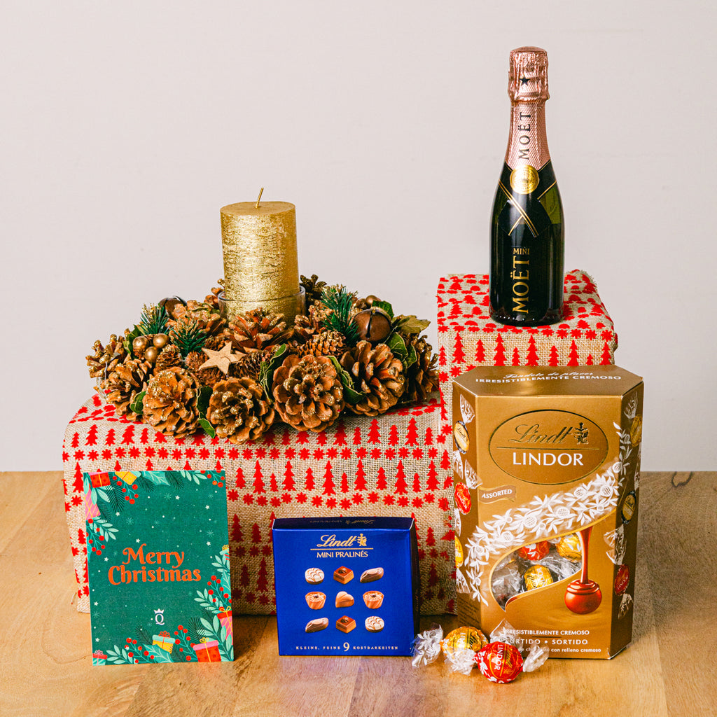 Verschicken Sie dieses Weihnachten Weihnachtsgrüße auf ganz besondere Weise mit diesem köstlich süßen Weihnachtskorb. Er enthält eine Auswahl an schokoladigen Leckereien, zartschmelzenden Keksen und einer Mini-Flasche Sekt – perfekt, um jemandem Besonderen eine Freude zu machen. Dieses Geschenk enthält außerdem einen traditionellen Weihnachtskranz mit echtem Laub sowie eine Weihnachtskarte, die Sie für den Empfänger personalisieren können. Geschenkinhalt: Weihnachtskarte Lindt Mini-Pralinen 44 g Weihnachtskranz, Tischdekoration Mini Moët Rosé 20 cl Lindor Cornet 337 g
