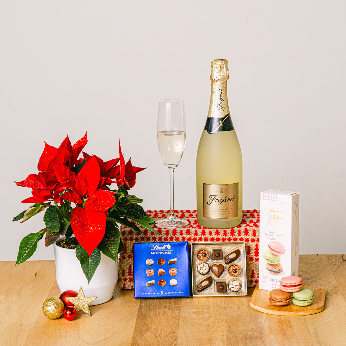 Der wunderschöne Weihnachtsstern wird mit dem Beginn eines Neuanfangs assoziiert, und seine leuchtende Farbe symbolisiert Hoffnung und Freude für das neue Jahr. Dazu gibt es eine Flasche Sekt (perfekt für einen Neujahrstoast!) und eine Auswahl köstlicher Süßigkeiten. Eine elegante Art, Ihren Lieben Freude und gute Wünsche zu übermitteln und den Beginn des Jahres 2025 zu feiern. Das Geschenk enthält: – einen Weihnachtsstern im Topf. – eine Flasche Sekt Freixenet Carta Nevada. – eine Auswahl an Mini-Pralinen aus Schweizer Schokolade (44 g). – eine Auswahl an verschiedenen Macarons (36 g).