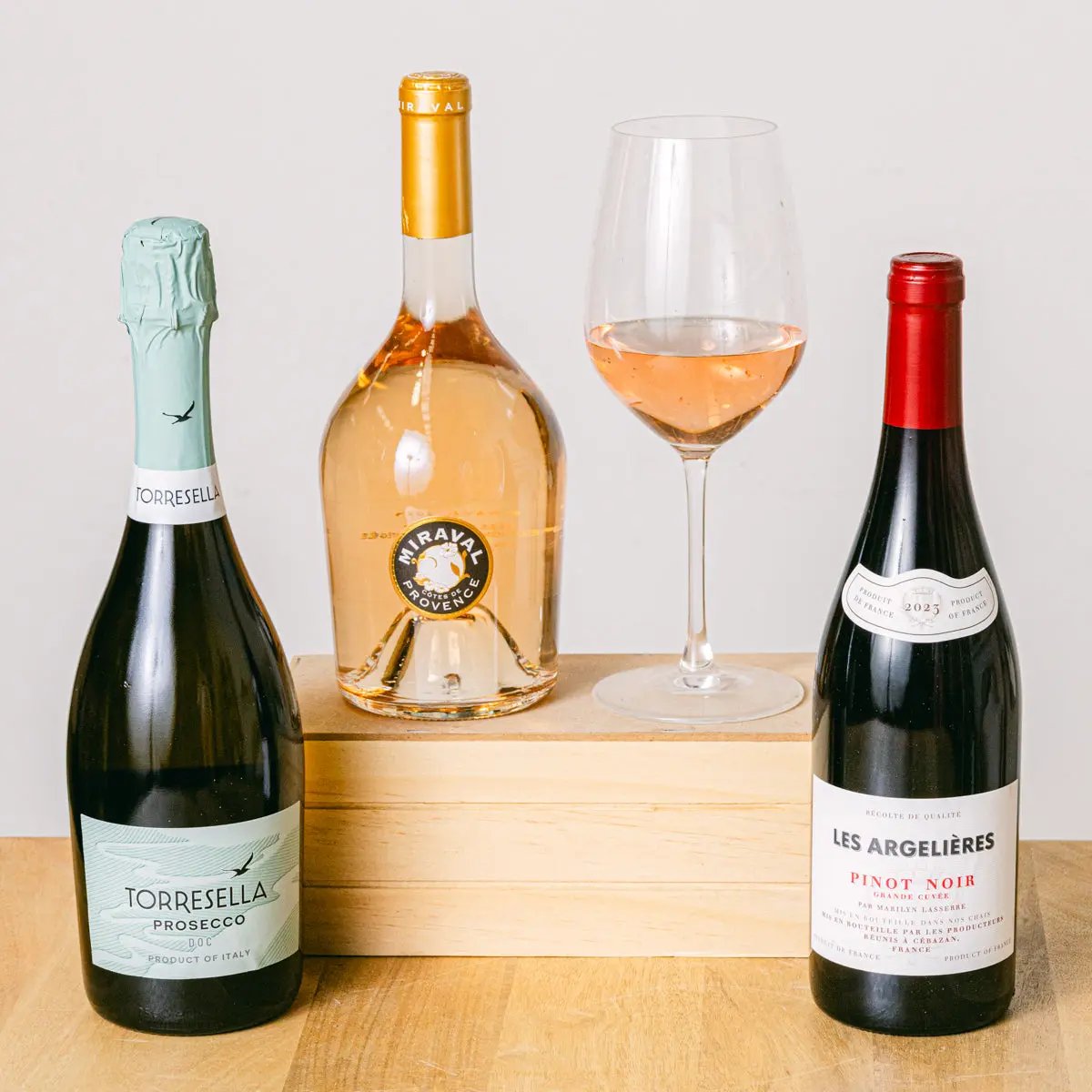 Diese kuratierte Kollektion umfasst drei außergewöhnliche Weine: den erfrischenden Miraval Rosé, den kräftigen Les Argelières Rotwein und den festlichen Torresella Schaumwein. Jede 75-cl-Flasche bietet ein einzigartiges Geschmacksprofil und verspricht eine vielfältige, aber harmonische Verkostungsreise.