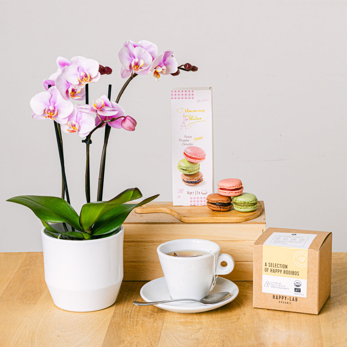 Beschenken Sie einen besonderen Menschen mit einem Geschenkkorb mit Tee und einer wunderschönen Mini-Orchidee! Unser Geschenkkorb ist voller Geschmack. Der für diesen Korb ausgewählte Tee ist eine einzigartige Mischung aus erstklassigen Aromen. Und um das Geschenk abzurunden, sorgt eine wunderschöne Mini-Orchidee mit ihrer herrlichen Farbe und ihrem Duft für gute Laune. Dieser Geschenkkorb ist eine tolle Möglichkeit, jemandem zu jedem Anlass eine Freude zu machen. Zaubern Sie ihm ein Lächeln ins Gesicht!