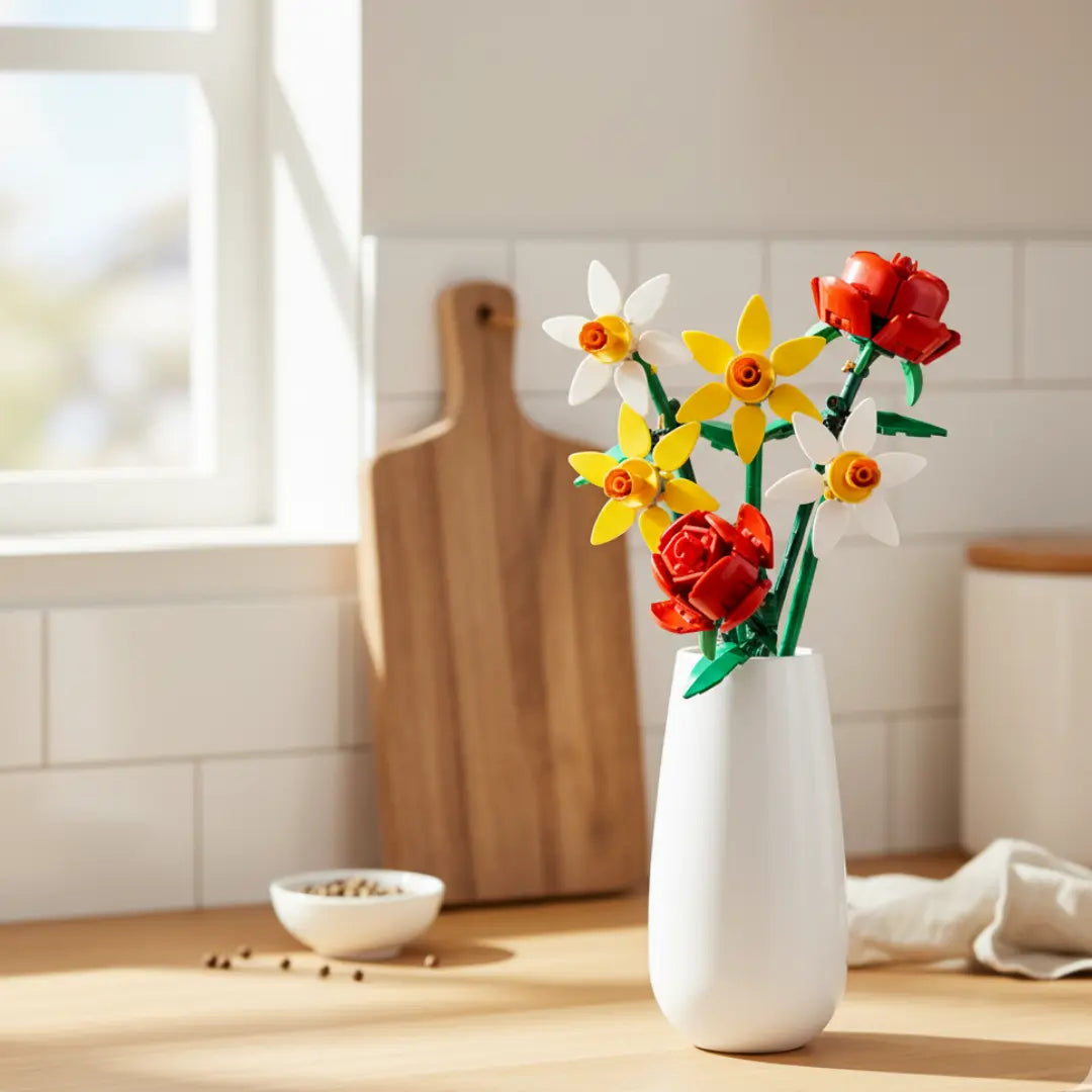 LEGO Blumenstrauß, eine lebendige Anordnung von kunstvoll hergestellten Rosen und Narzissen, die Schönheit bieten, die niemals verblassen wird.