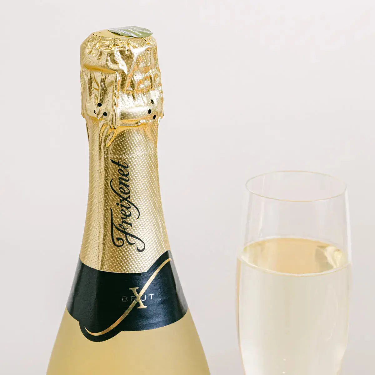 Ergänzungen:Lebhafte Poinsettia-Pflanze, eine Flasche Freixenet Cava Carta Nevada für sofortige Feierlichkeiten.
