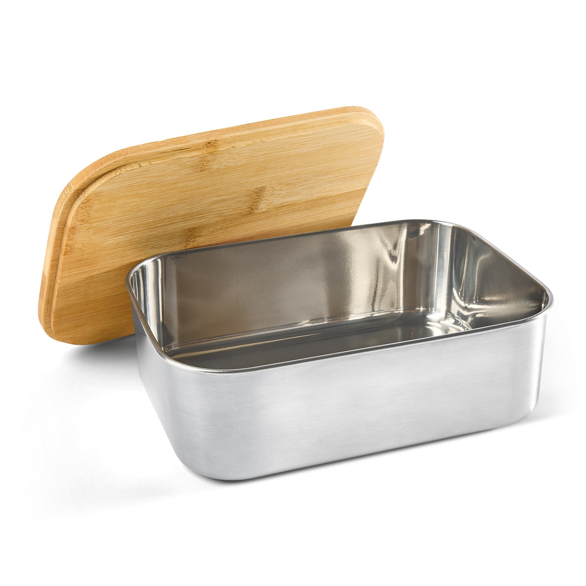 Eine personalisierte Lunchbox mit Namen oder Text. Edelstahl mit Bambusdeckel.