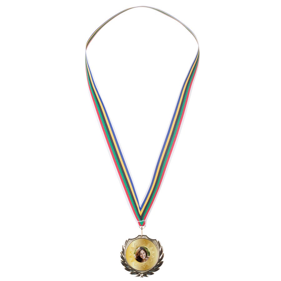 Weitere InformationenMaterial: Metall mit BandFarbe: GoldGröße Medaille: ø 7cm / 2,8"Größe Druck: ø 5cm / 2"