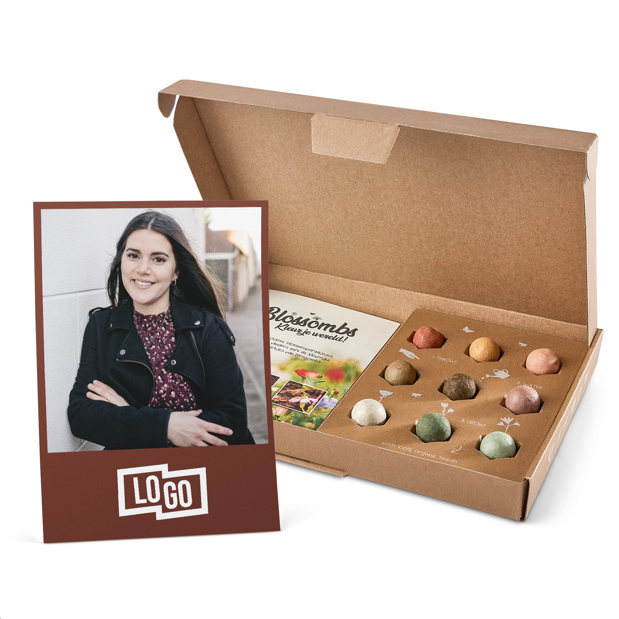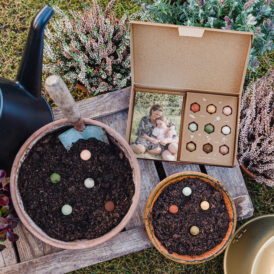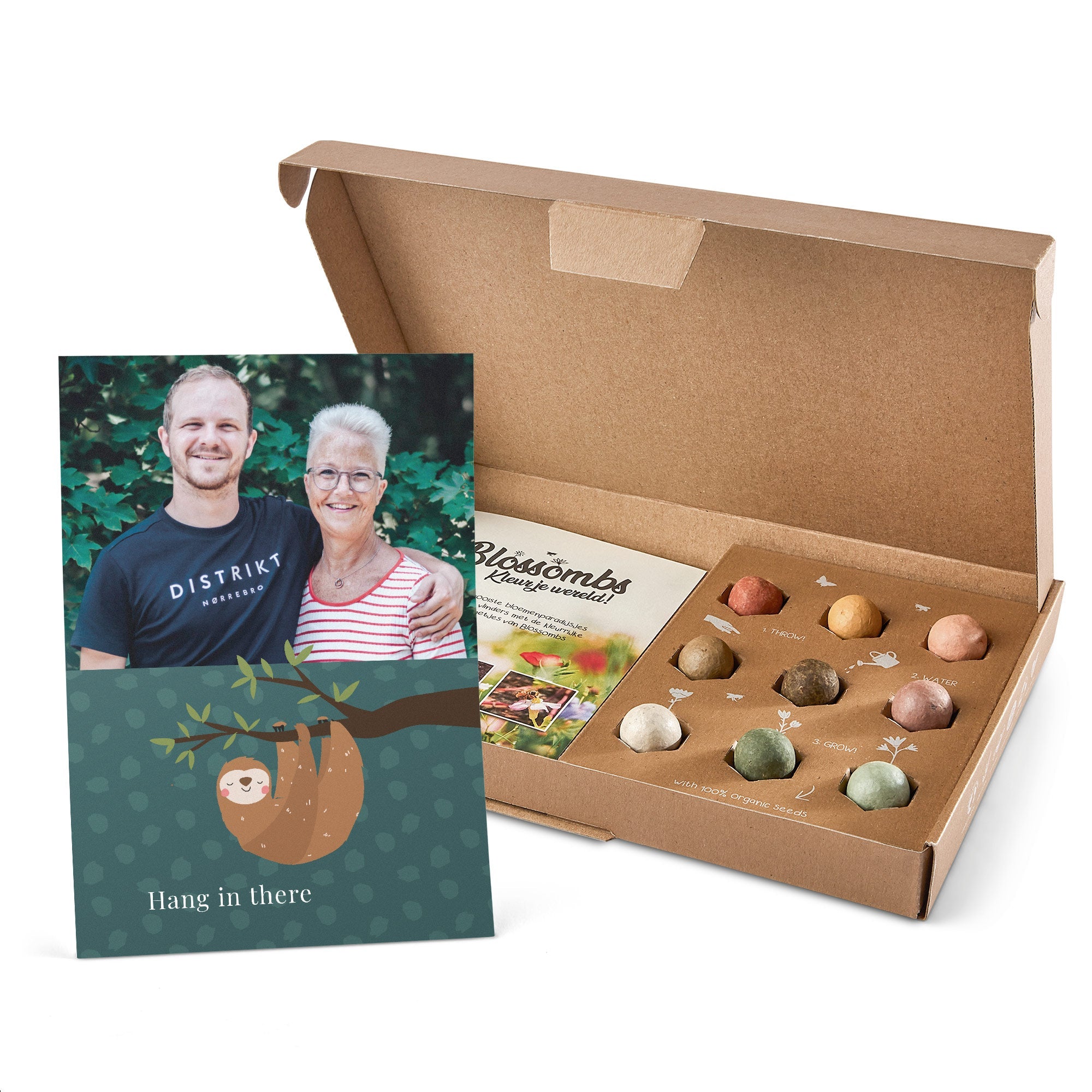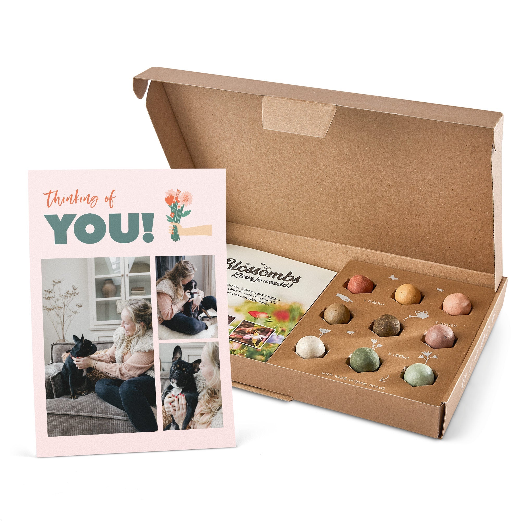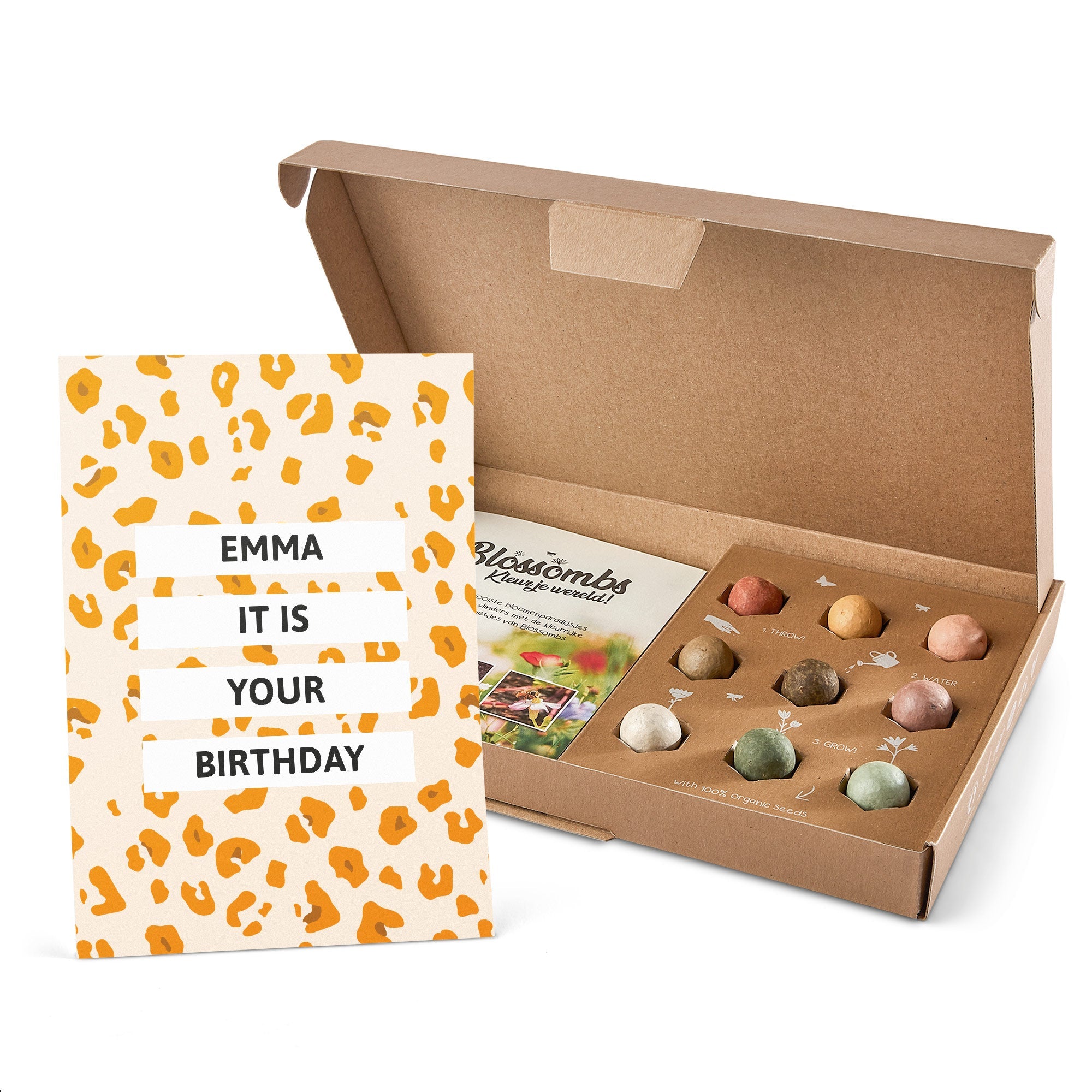 Geschenkbox mit Wildblumen-Samenbomben und personalisierter Grußkarte. Gestalten Sie jetzt Ihre eigene!