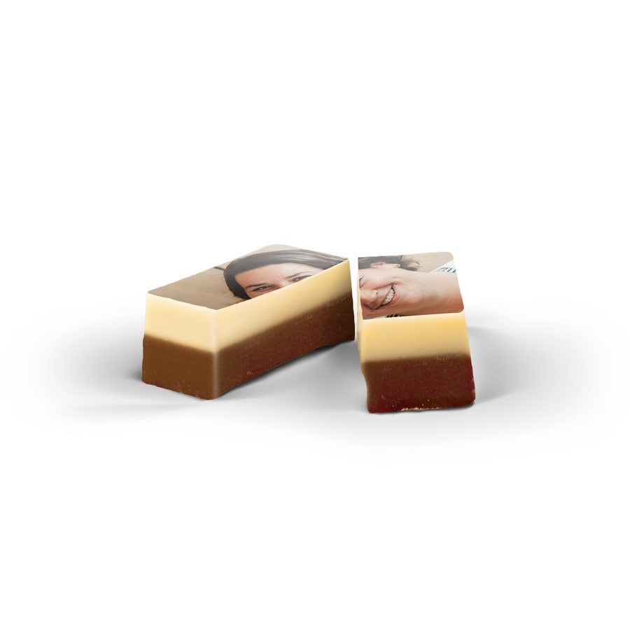Mehr Informationen zu den personalisierten Pralinen:Menge: Set mit 15, 24 oder 60 PralinenGröße: 2,6 x 2,6 cm pro Praline, kann pro Praline leicht variierenSchokolade: Milchschokolade mit einer Schicht weißer Schokolade obenaufForm: quadratischPersonalisierung: mit Foto oder Logo bedrucktDruck: essbarer Druck in VollfarbeBei Temperaturen von 25 °C oder mehr empfehlen wir Ihnen, Ihrer Bestellung ein Kühlelement hinzuzufügen. Aufbewahrungshinweis: Kühl und dunkel bei 14–18 °C bis zu 10 Wochen haltbar. Allergiehinweis: Enthält Soja, Milch und kann Spuren von Nüssen enthalten.Zutaten:Milchschokolade: Zucker, Kakaobutter, Vollmilchpulver, Kakaomasse, Emulgator (Sojalecithin), natürliches Vanillearoma. Mindestens 34 % Kakaoanteil. Weiße Schokolade: Zucker, Kakaobutter, Vollmilchpulver, Emulgator (Sojalecithin), natürliches Vanillearoma. Mindestens 29 % Kakaoanteil.
