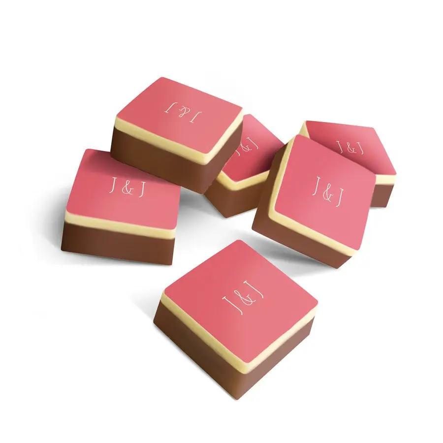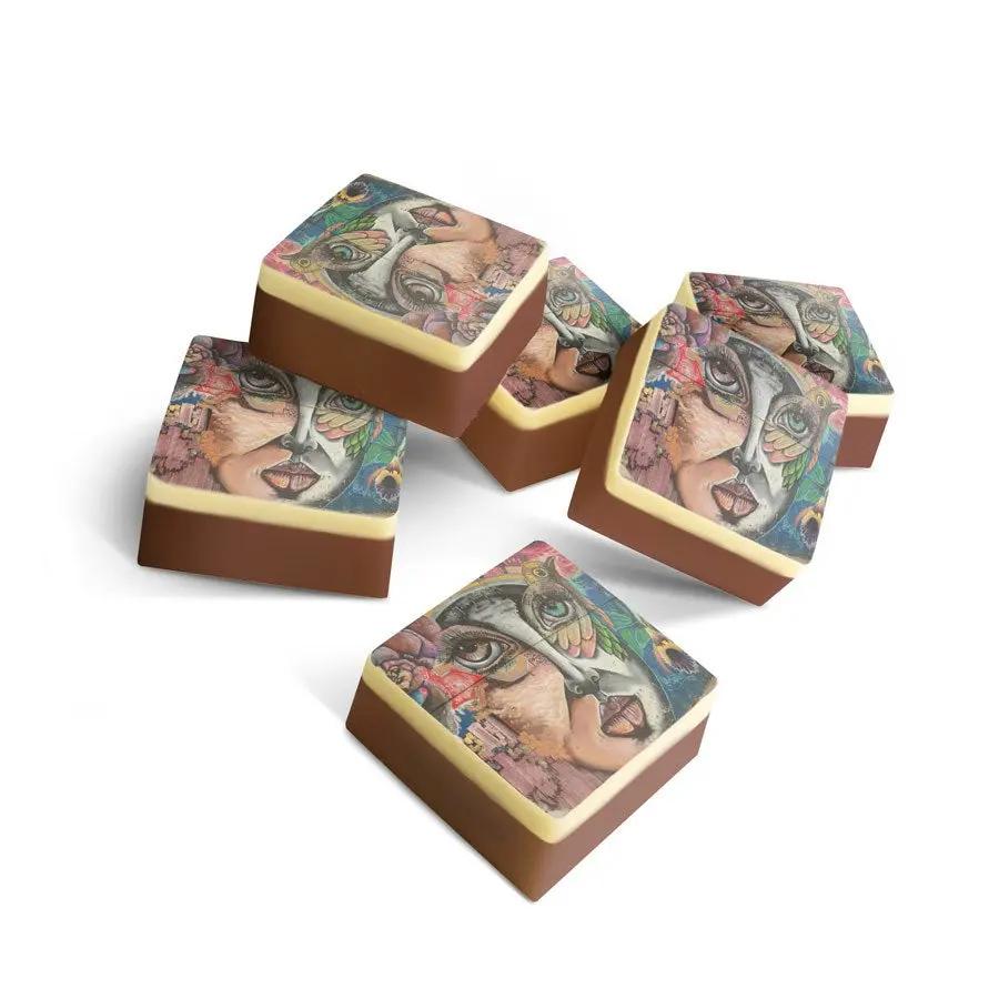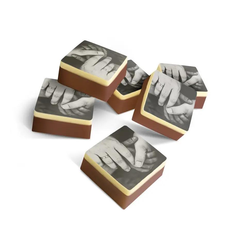 Mehr Informationen zu den personalisierten Pralinen:Menge: Set mit 15, 24 oder 60 PralinenGröße: 2,6 x 2,6 cm pro Praline, kann pro Praline leicht variierenSchokolade: Milchschokolade mit einer Schicht weißer Schokolade obenaufForm: quadratischPersonalisierung: mit Foto oder Logo bedrucktDruck: essbarer Druck in VollfarbeBei Temperaturen von 25 °C oder mehr empfehlen wir Ihnen, Ihrer Bestellung ein Kühlelement hinzuzufügen. Aufbewahrungshinweis: Kühl und dunkel bei 14–18 °C bis zu 10 Wochen haltbar. Allergiehinweis: Enthält Soja, Milch und kann Spuren von Nüssen enthalten.Zutaten:Milchschokolade: Zucker, Kakaobutter, Vollmilchpulver, Kakaomasse, Emulgator (Sojalecithin), natürliches Vanillearoma. Mindestens 34 % Kakaoanteil. Weiße Schokolade: Zucker, Kakaobutter, Vollmilchpulver, Emulgator (Sojalecithin), natürliches Vanillearoma. Mindestens 29 % Kakaoanteil.